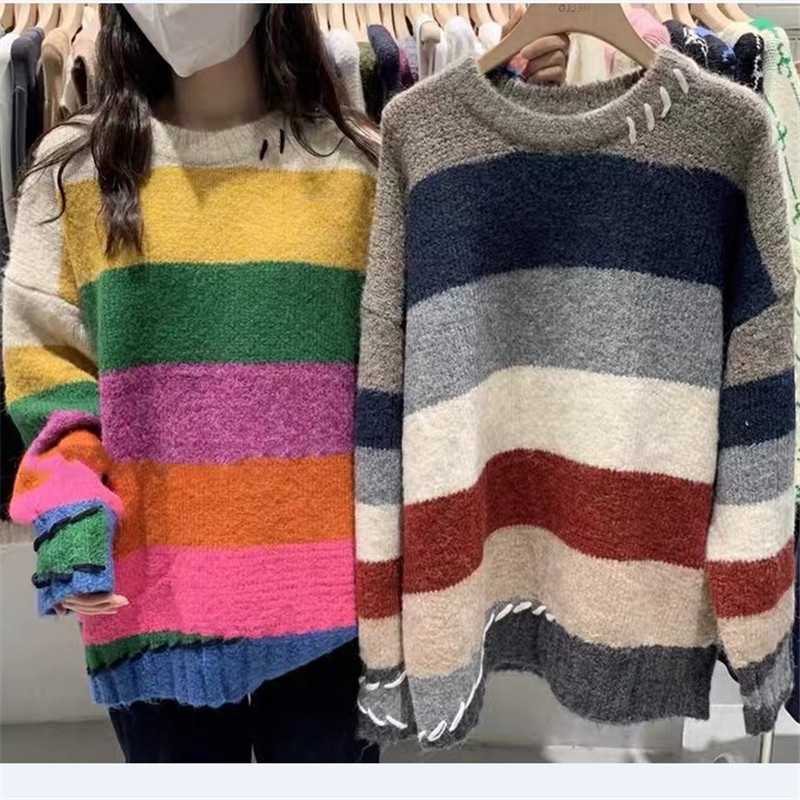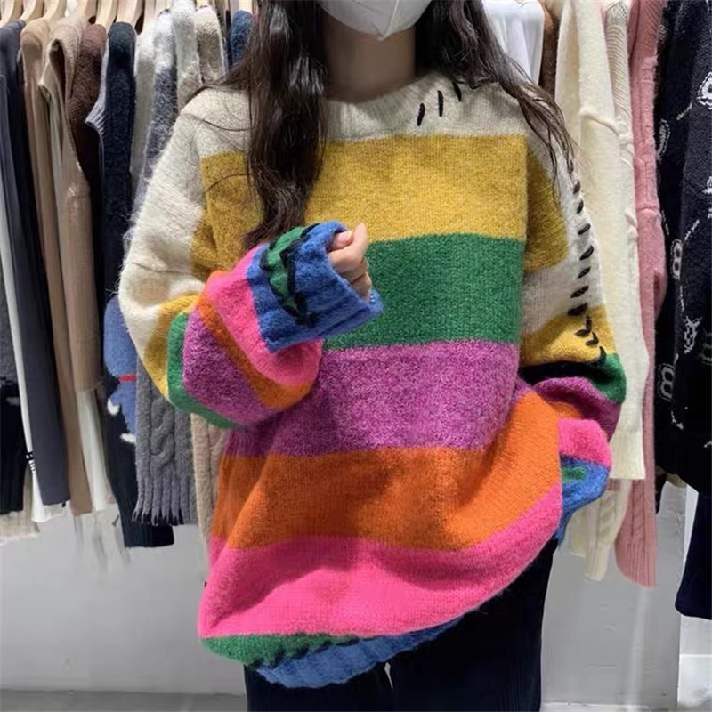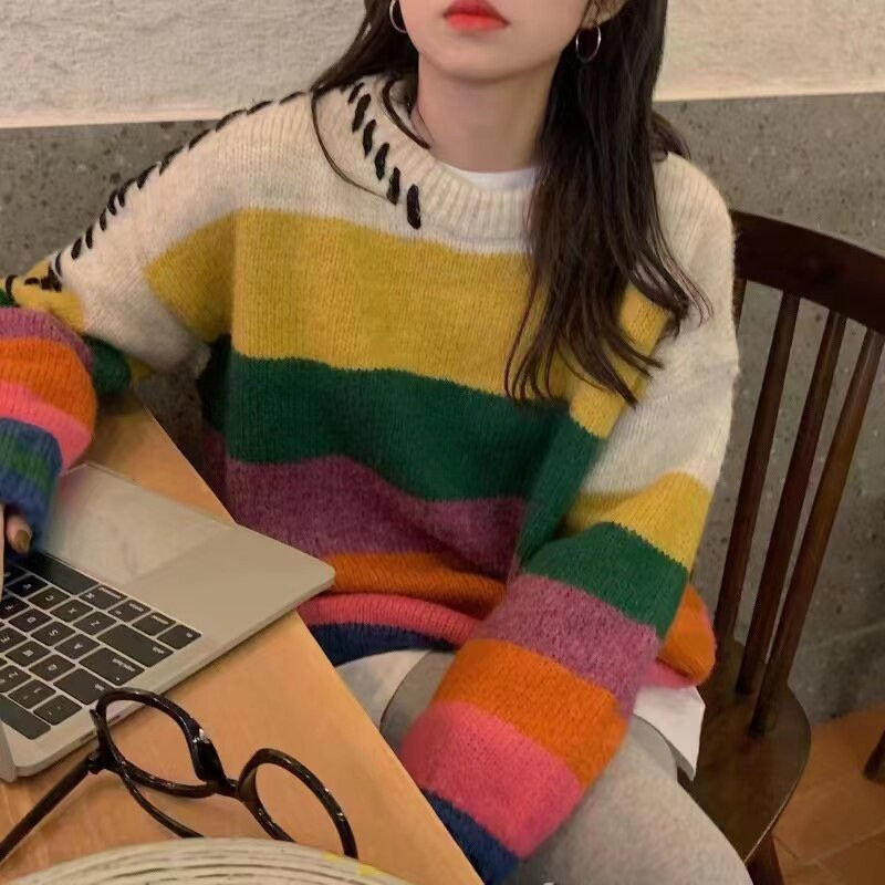 Rainbow Strip Loose Pullover Female