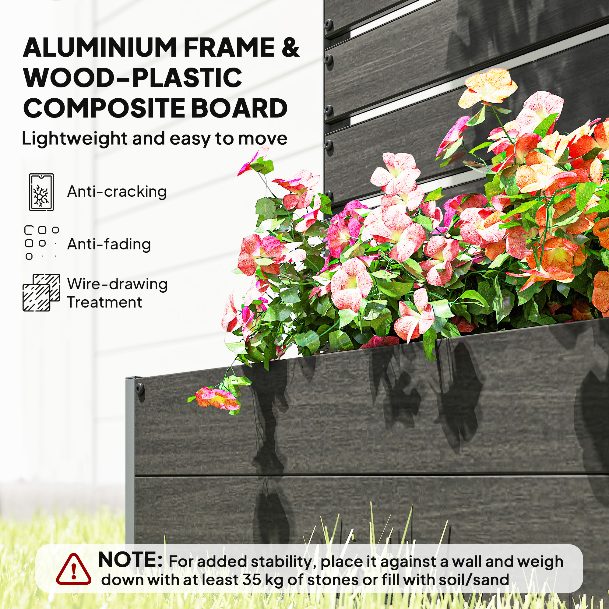 This garden planter does more: it comes with a slat trellis back for climbing plants and vines - and even doubles as a privacy screen, making it suitable for balconies, patios or any outdoor space where a little seclusion is welcome. An aluminium frame ensures a strong structure, fitted with wood-plastic boards that are weather-resistant. The outdoor planter is built to last, offering a versatile and thriving garden space - with both function and style - wherever you place it.