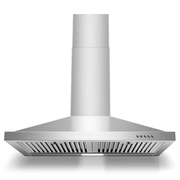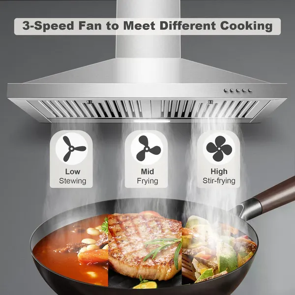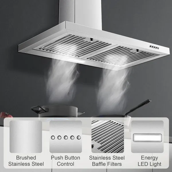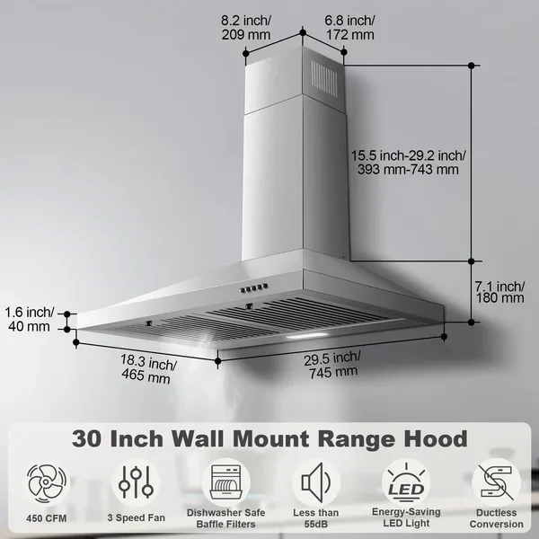 Range Hood 30 Inch, Wall Mount Range Hood Ducted/Ductless, Kitchen Hood In Stainless Steel, Vent Hood With Baffle Filters, 3 Speed Fan, Push Button Control, Energy-Saving LED Light