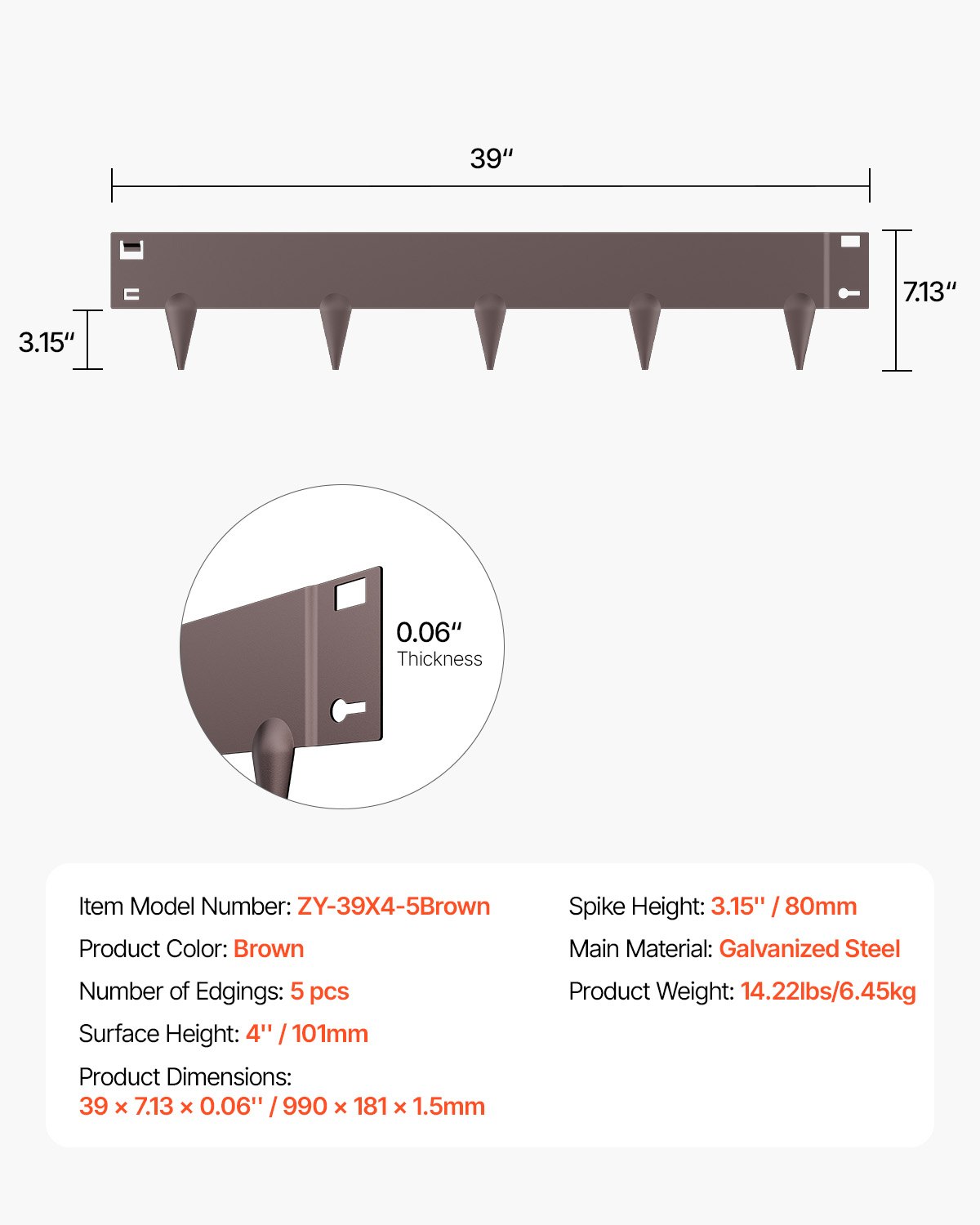 Anzahl Kanten: 5 Stück, Produktfarbe: Braun, Produktgewicht: 14,22 lbs / 6,45 kg, Hauptmaterial: Verzinkter Stahl, Spikehöhe: 3,15 Zoll/80 mm,Artikelmodellnummer: ZY-39X4-5Brown, Oberflächenhöhe: 4 Zoll/101 mm, Produktabmessungen: 39 x 7,13 x 0,06 Zoll/ 990 x 181 x 1,5 mm