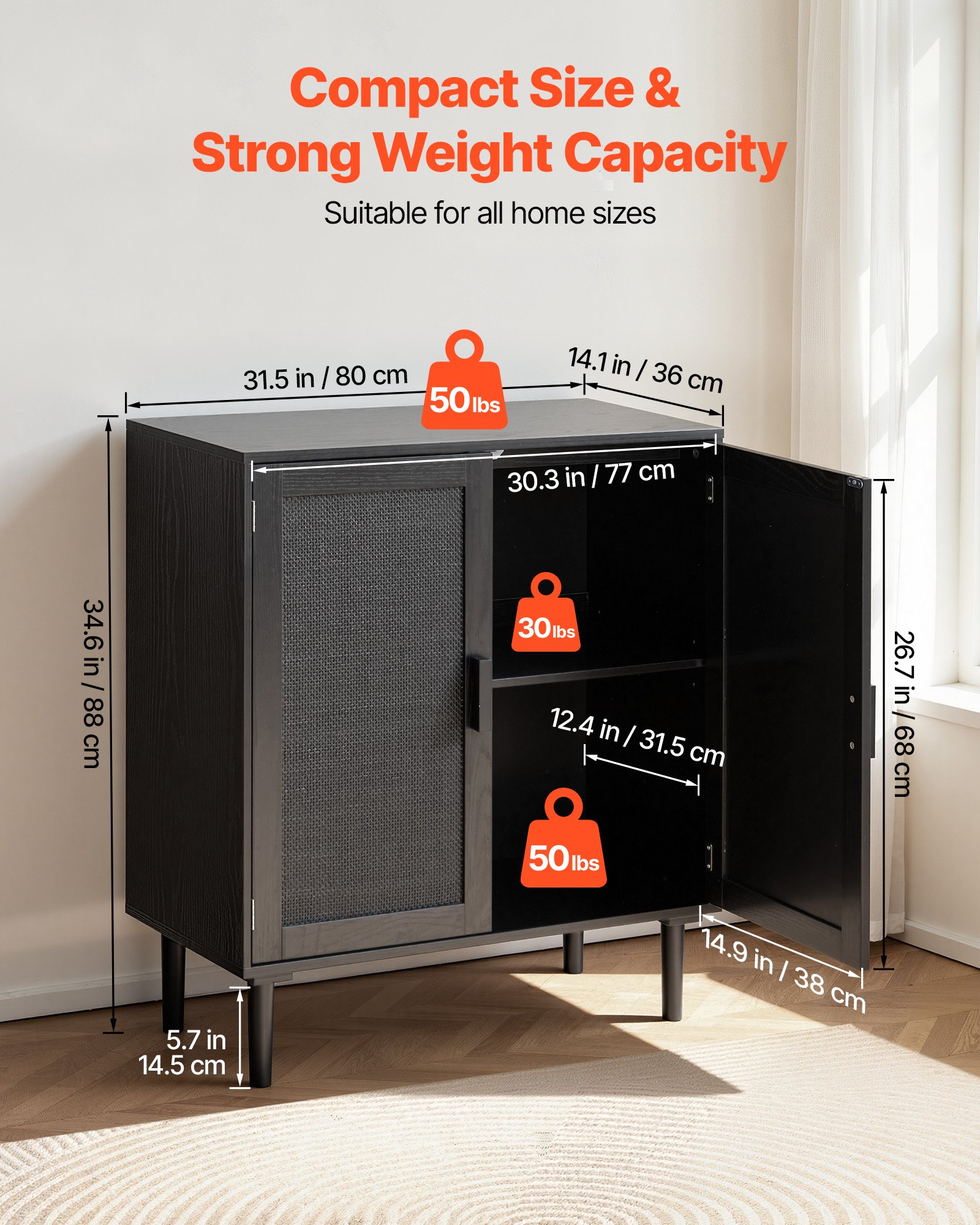 User-Friendly Details: The rattan buffet cabinet features 5.7 in/14.5 cm raised legs for easy robot vacuum access. Its magnetic doors ensure good closure. An anti-tipping device is included for added stability