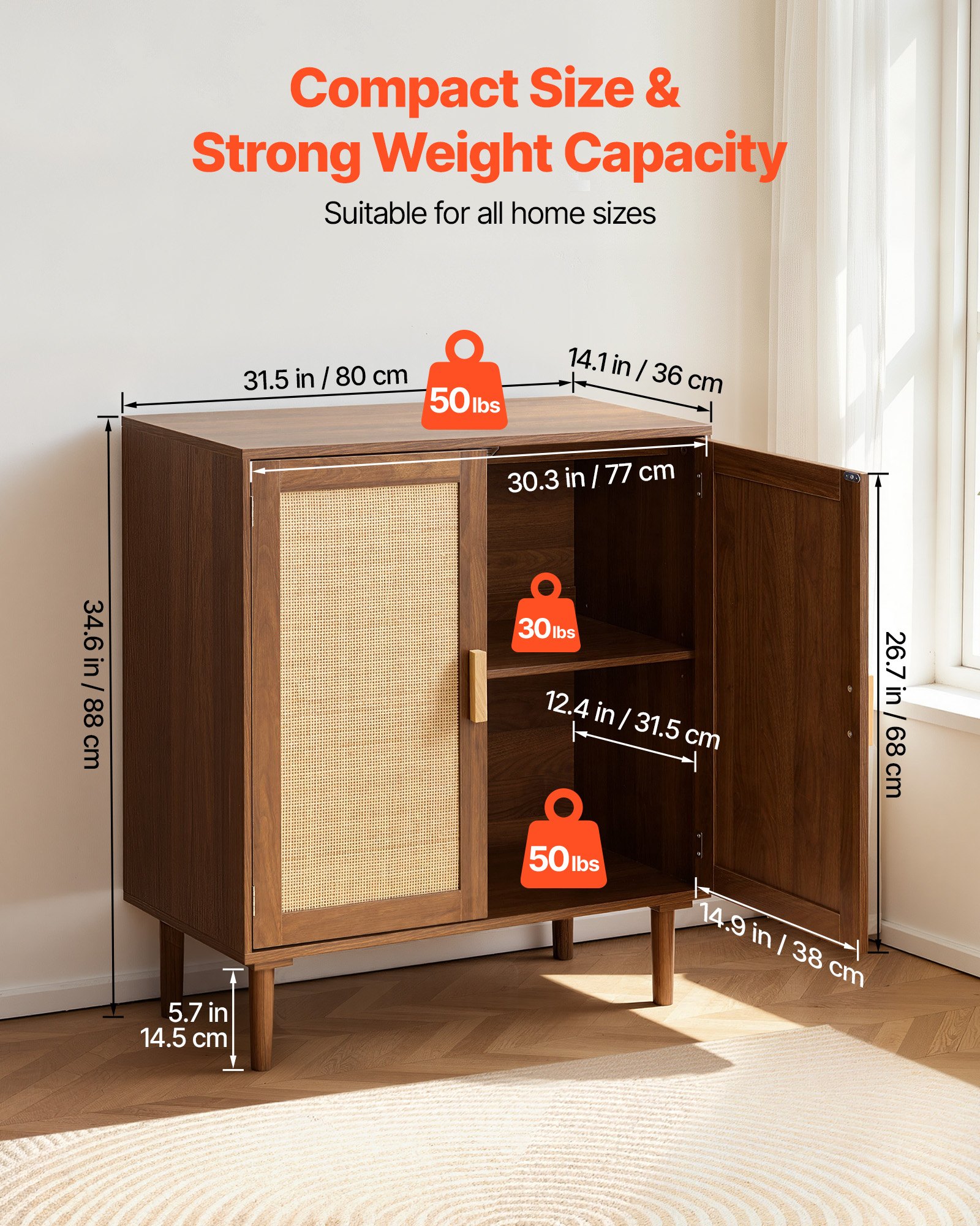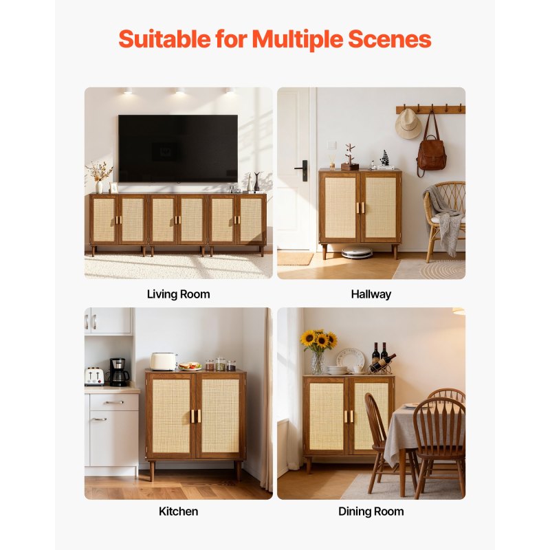 User-Friendly Details: The rattan buffet cabinet features 5.7 in/14.5 cm raised legs for easy robot vacuum access. Its magnetic doors ensure good closure. An anti-tipping device is included for added stability