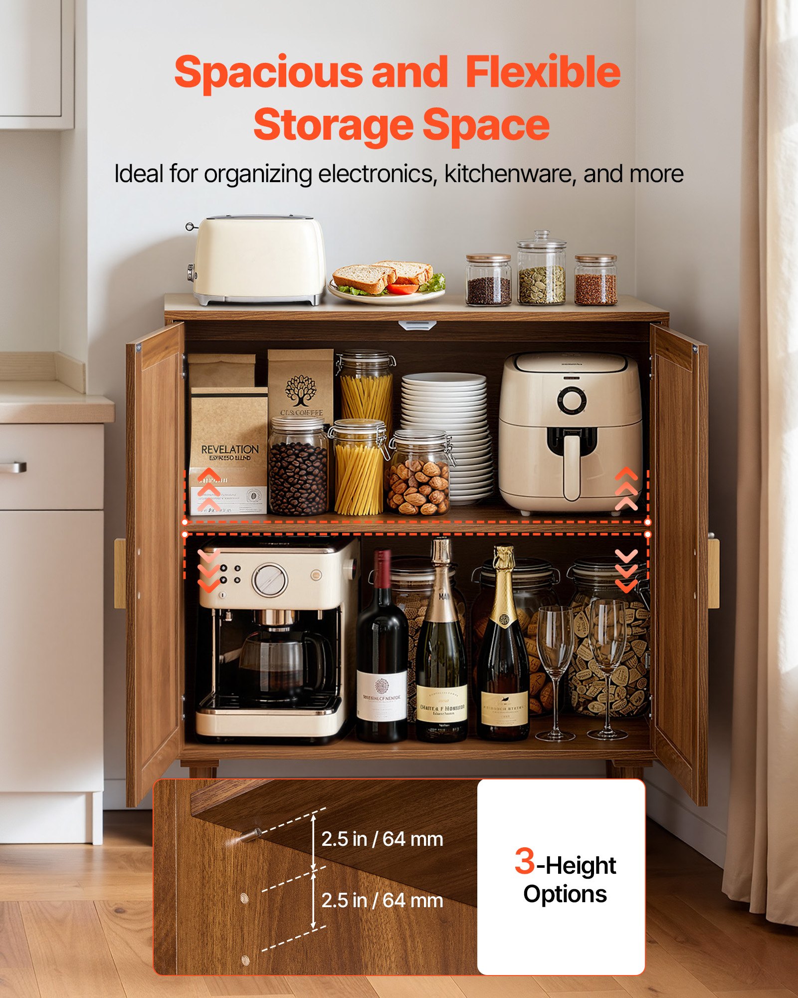 Sturdy Structure: Made of thickened particleboard, the buffet cabinet’s tabletop can withstand daily wear. Its top and bottom shelves support up to 50 lbs / 22.7 kg, while each inner shelf holds up to 30 lbs /13.6 kg, ideal for storing coffee machines