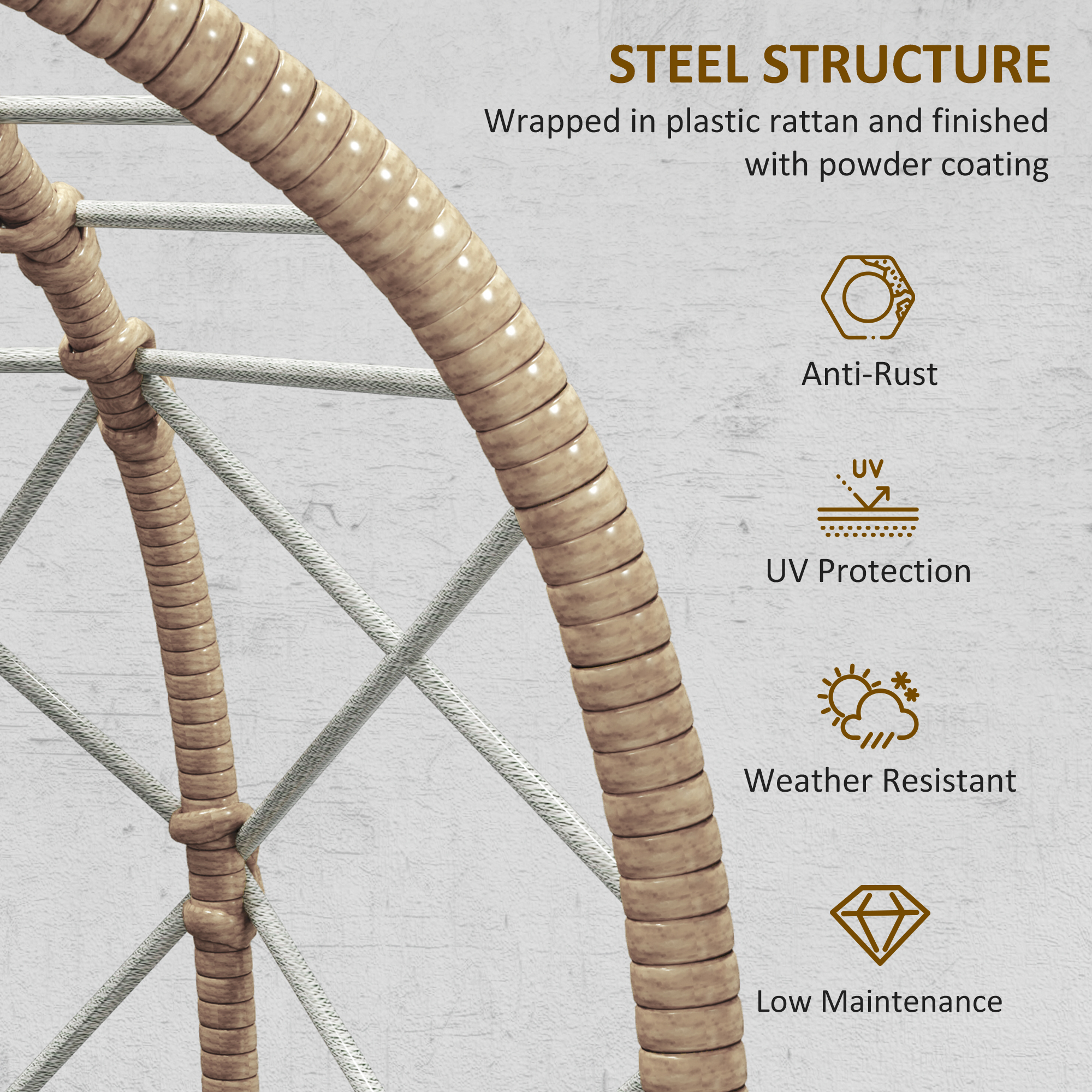 Relax in optimal comfort with this outdoor standing egg chair from ! This rattan garden chair with a rope woven hollow-out design is like a cosy bird-nest retreat. 20cm thickened cushion and a separate head pillow offer luxurious comfort. A steel frame means a strong, supportive core, whilst the outer plastic rattan wicker offers a stylish and protective top. Complete with a side cup holder for keeping drink within reach.