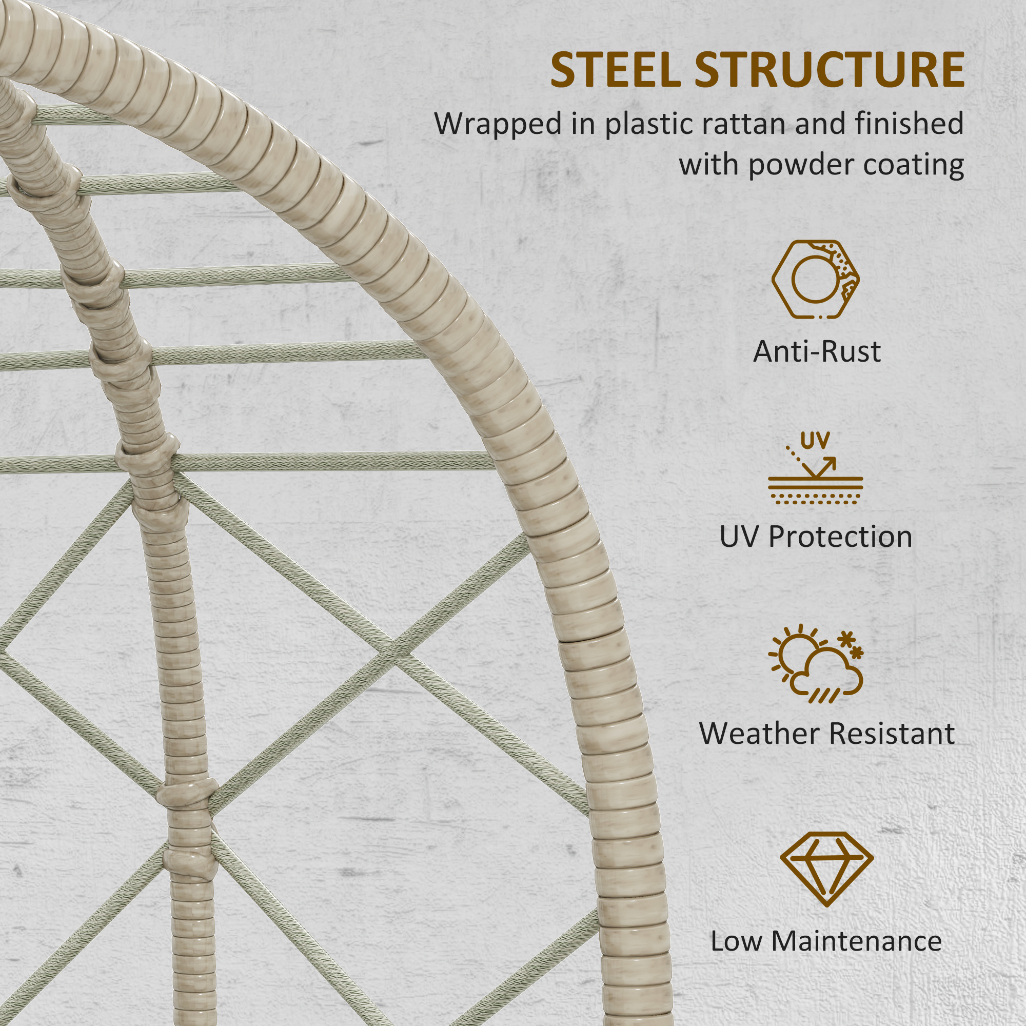 Relax in optimal comfort with this outdoor standing egg chair from ! This rattan garden chair with a rope woven hollow-out design is like a cosy bird-nest retreat. 20cm thickened cushion and a separate head pillow offer luxurious comfort. A steel frame means a strong, supportive core, whilst the outer plastic rattan wicker offers a stylish and protective top. Complete with a side cup holder for keeping drink within reach.