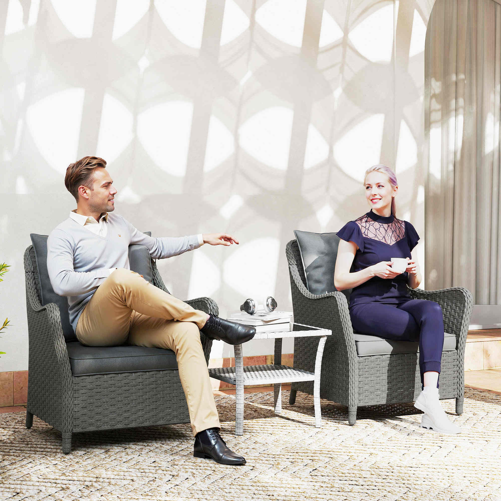 Sink into plenty of comfort outdoors with this rattan armchair set. A steel frame with powder coating means a strong core, wrapped in tough plastic rattan for a protective outer. Soft padding seat cushions and tufted back cushions ensure comfort, with removable and washable seat cushion covers for hygiene. Each outdoor armchair is complete with curved armrests and high backs for extra relaxation.