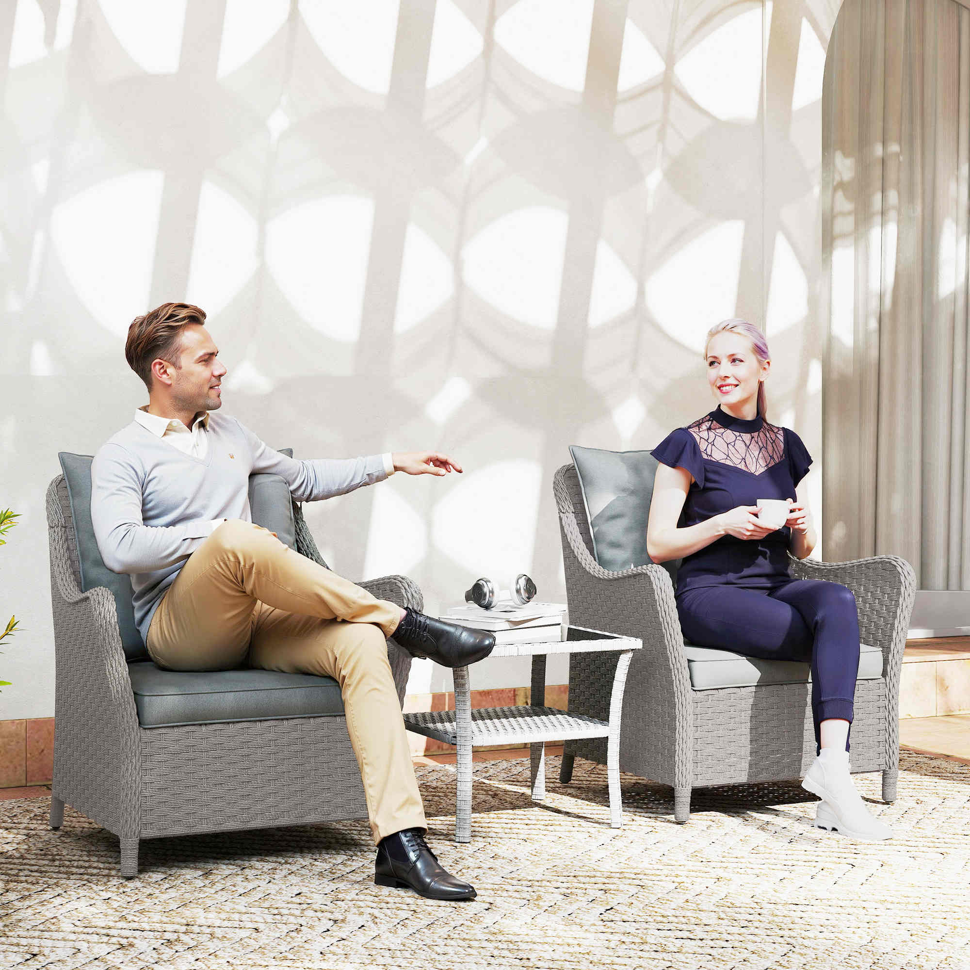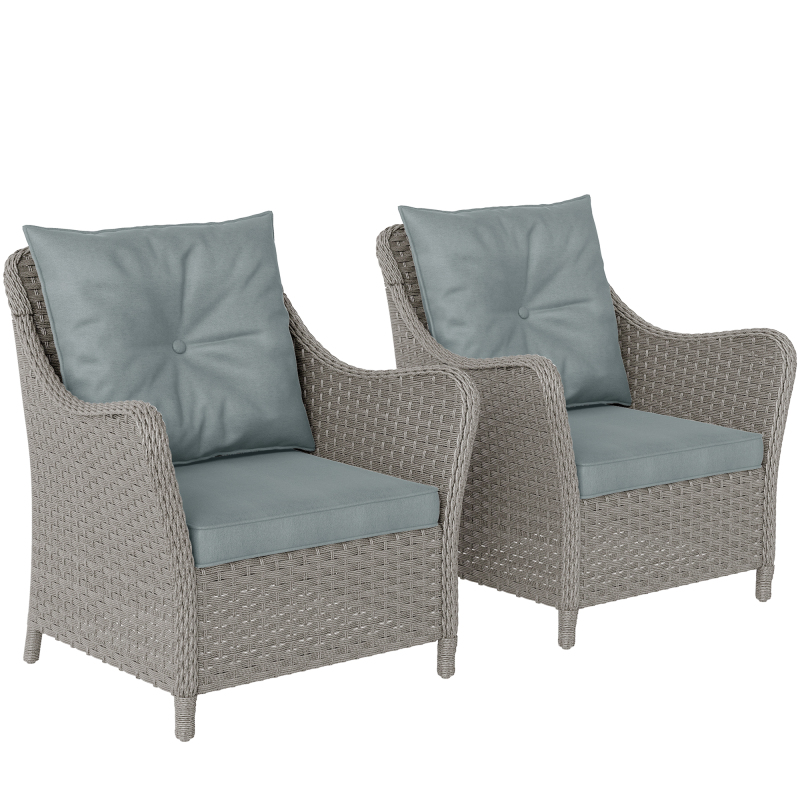 Sink into plenty of comfort outdoors with this rattan armchair set. A steel frame with powder coating means a strong core, wrapped in tough plastic rattan for a protective outer. Soft padding seat cushions and tufted back cushions ensure comfort, with removable and washable seat cushion covers for hygiene. Each outdoor armchair is complete with curved armrests and high backs for extra relaxation.
