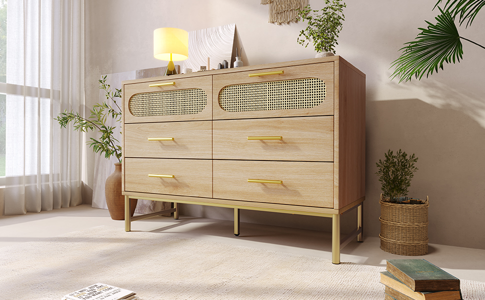 Product Name:Rattan Sideboard Storage Cabinet with 6 Drawers, Cupboard Sideboards for Living Room, Bedroom, and Hallway, Metal Handles, Anti-Tip, 120 x 40 x 74 cm, Oak