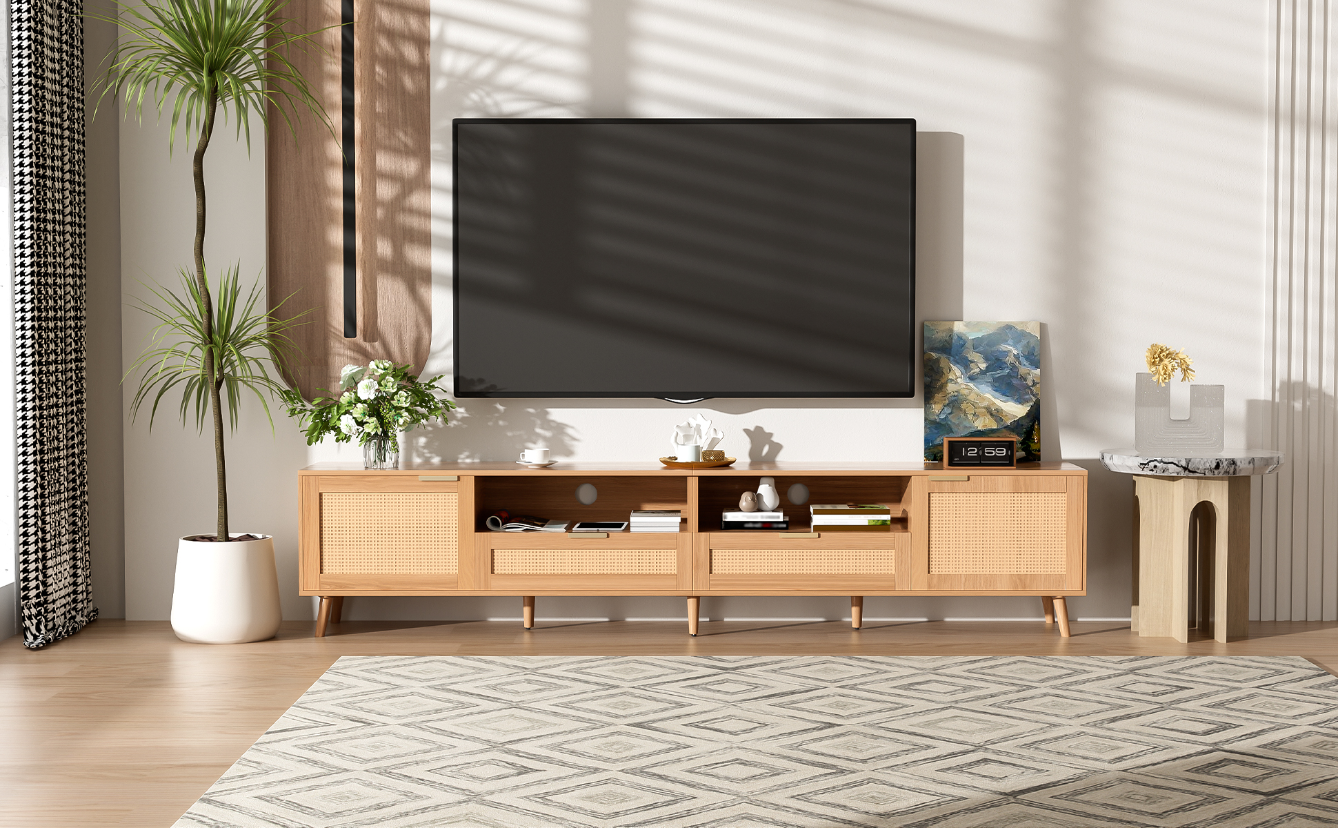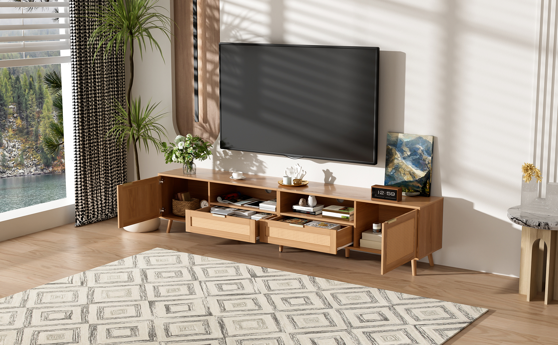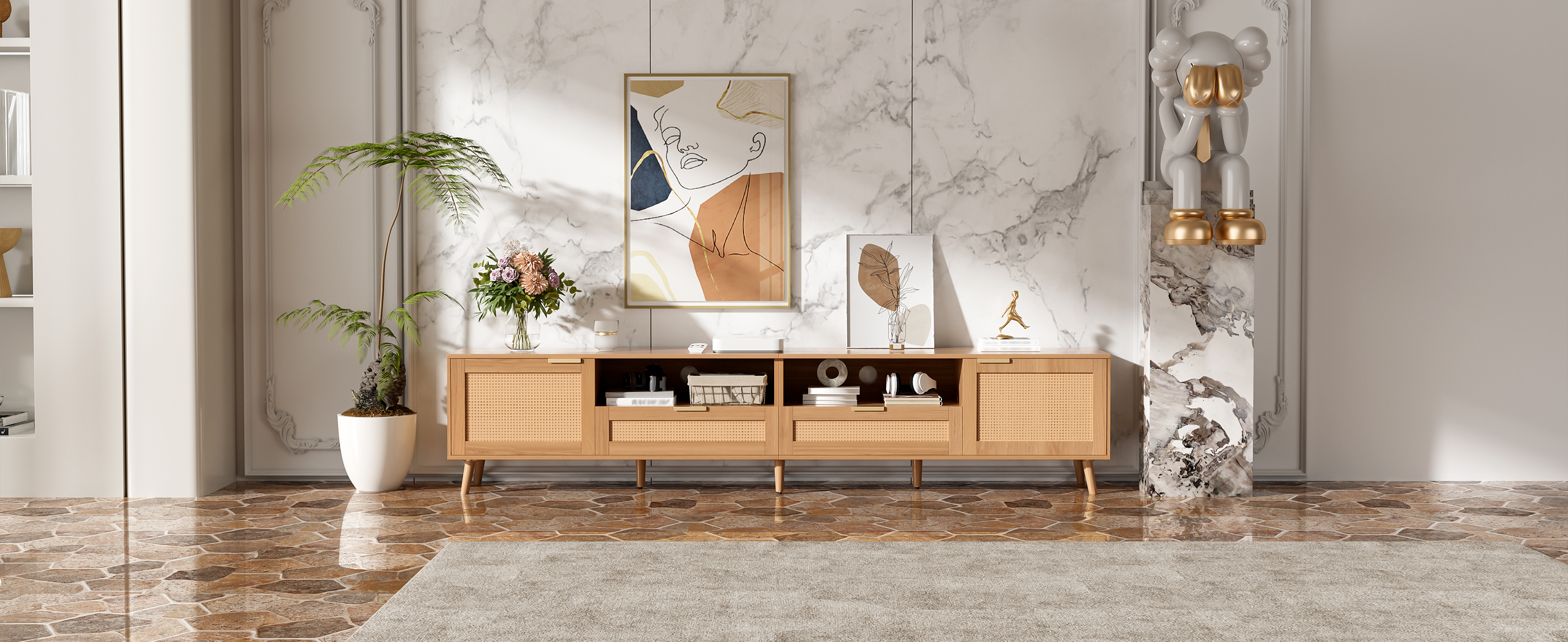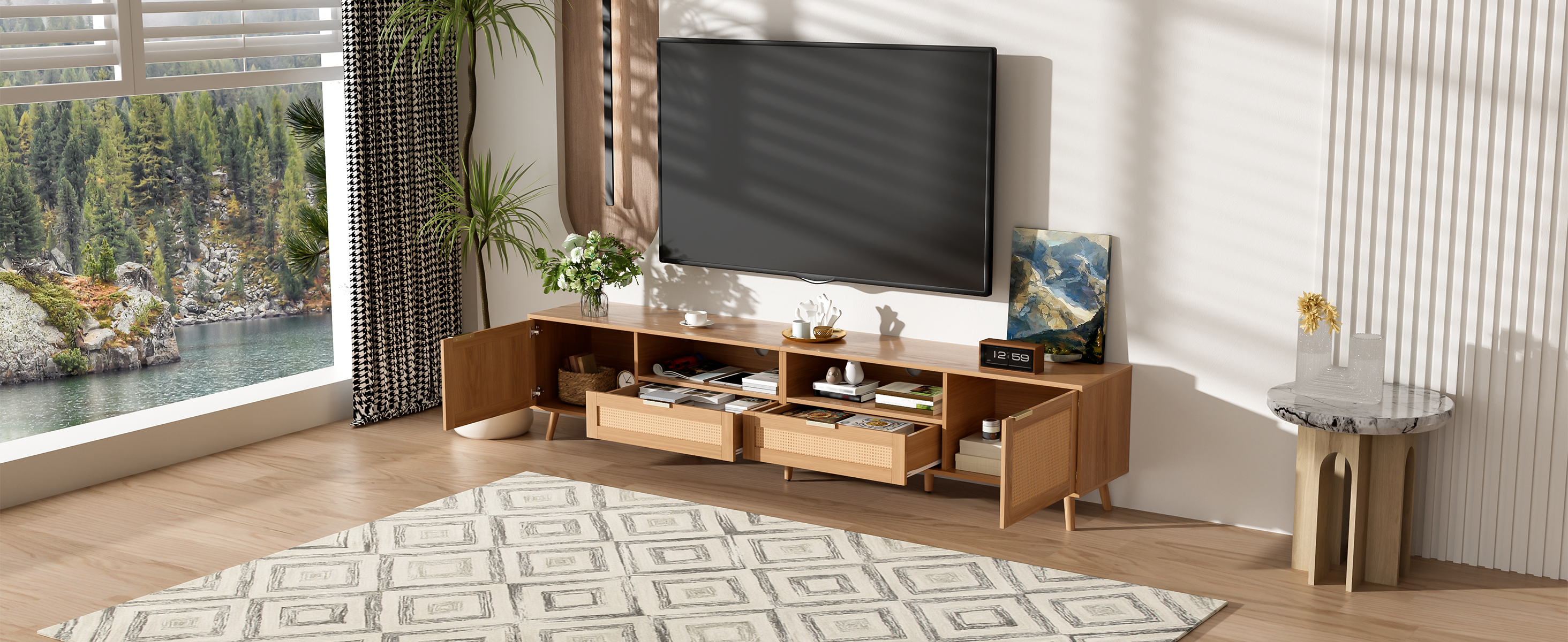 • [Ample Storage] Our Rattan TV Stand features 2 spacious storage cabinets and two open shelves, providing plenty of space for all your media devices, accessories, and more. Keep your living room organized and clutter-free.