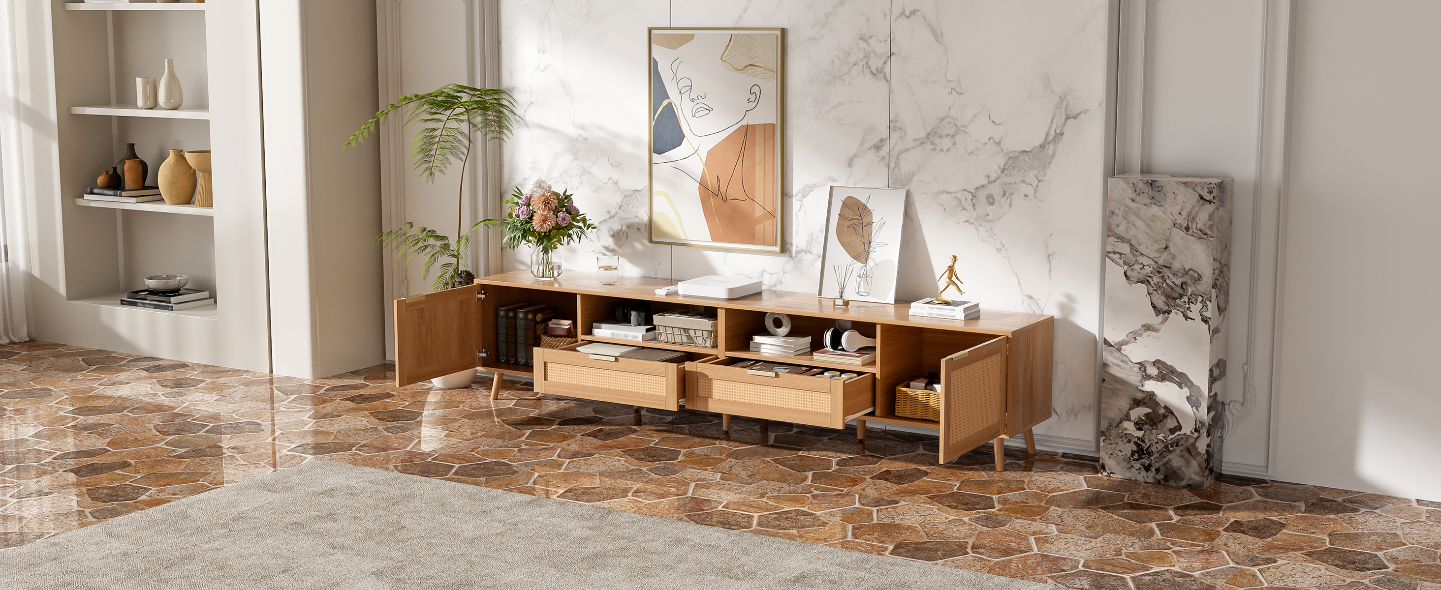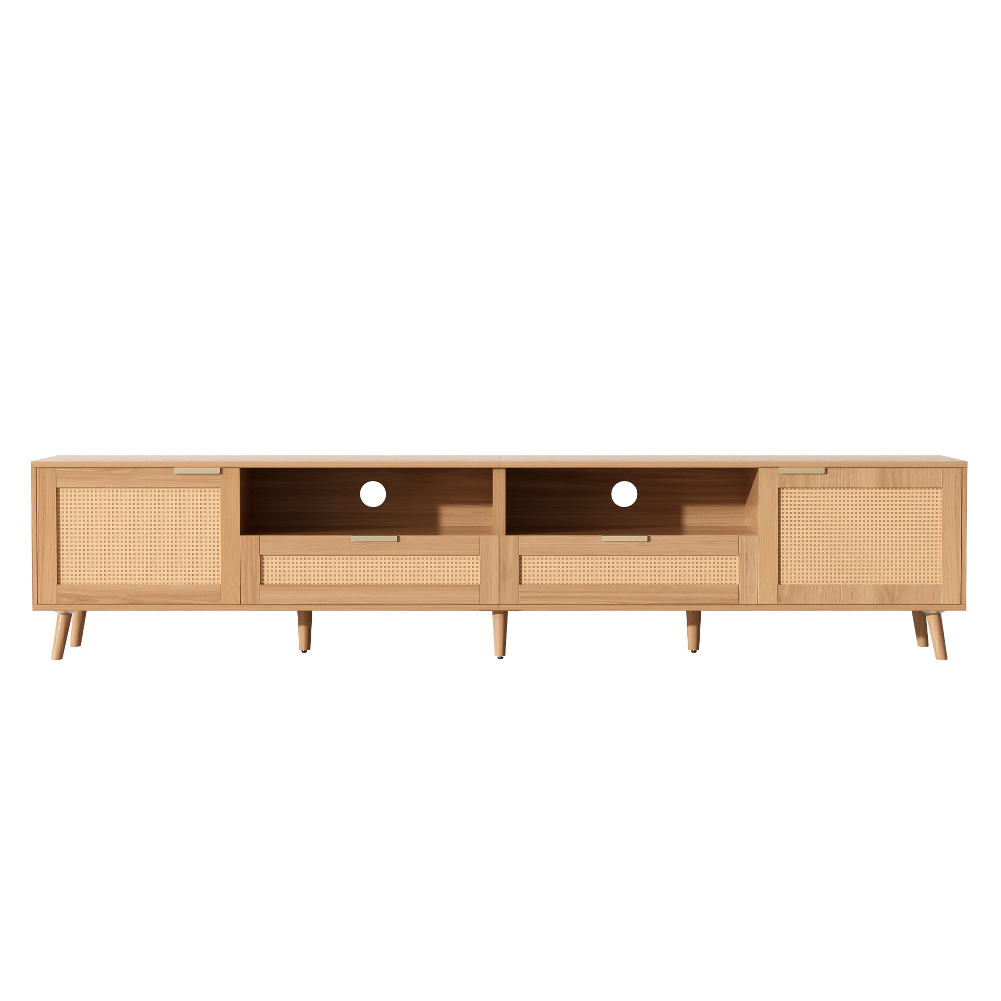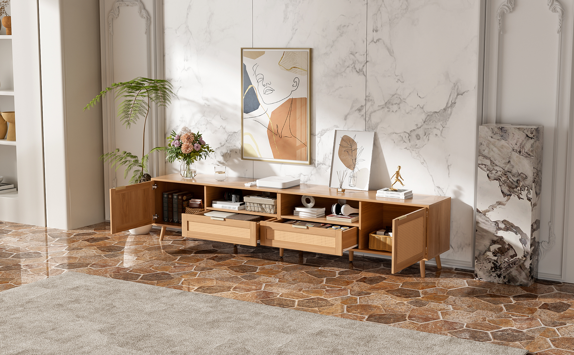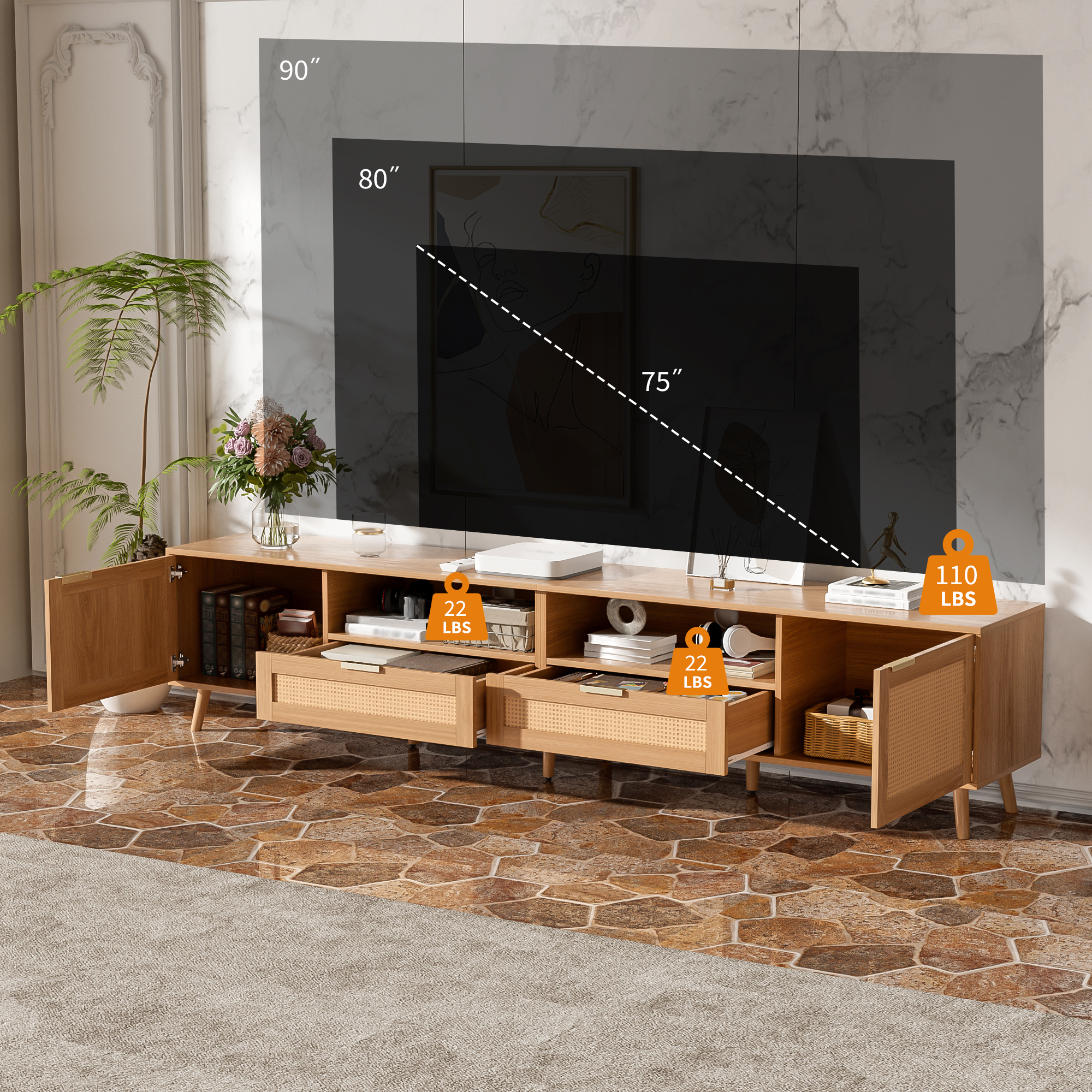 • [Ample Storage] Our Rattan TV Stand features 2 spacious storage cabinets and two open shelves, providing plenty of space for all your media devices, accessories, and more. Keep your living room organized and clutter-free.