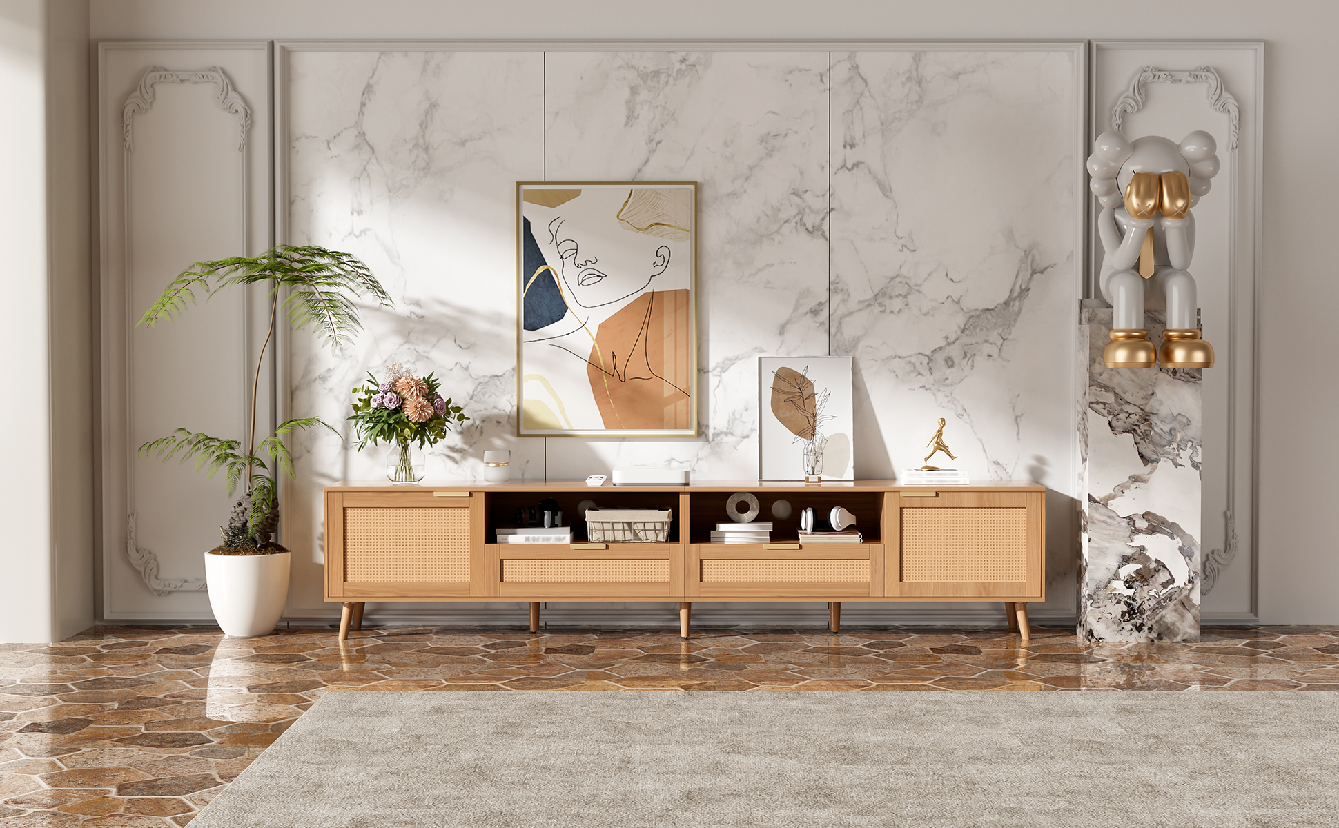 • [Modern Elegance] Enhance the style of your home with our modern rattan TV stand. With its contemporary design and high-quality craftsmanship, this TV stand adds a touch of sophistication to any room.