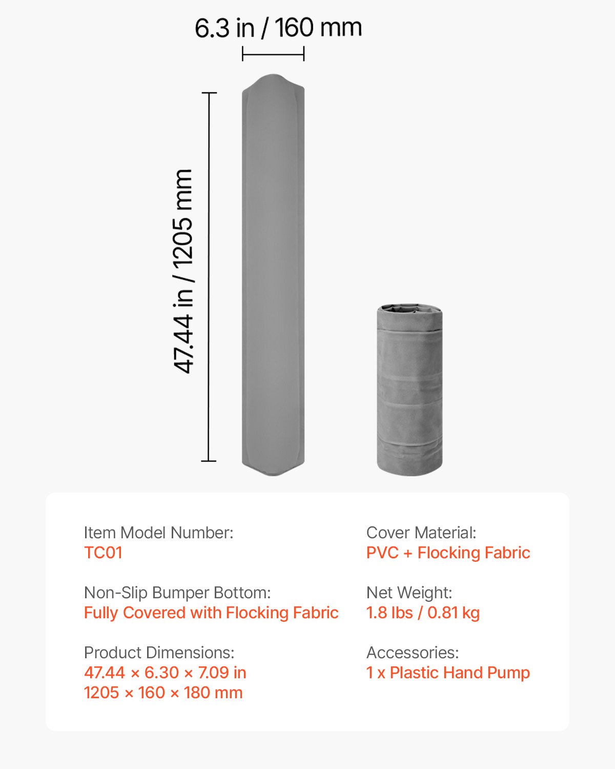 Nettogewicht: 1,8 lbs / 0,81 kg,Bezugsmaterial: PVC + Beflockungsstoff,Rutschfester Sto_fänger: Vollständig mit Flockstoff überzogen,Produktabmessungen: 47,44 x 6,30 x 7,09 Zoll / 1205 x 160 x 180 mm,Artikelmodellnummer: TC01