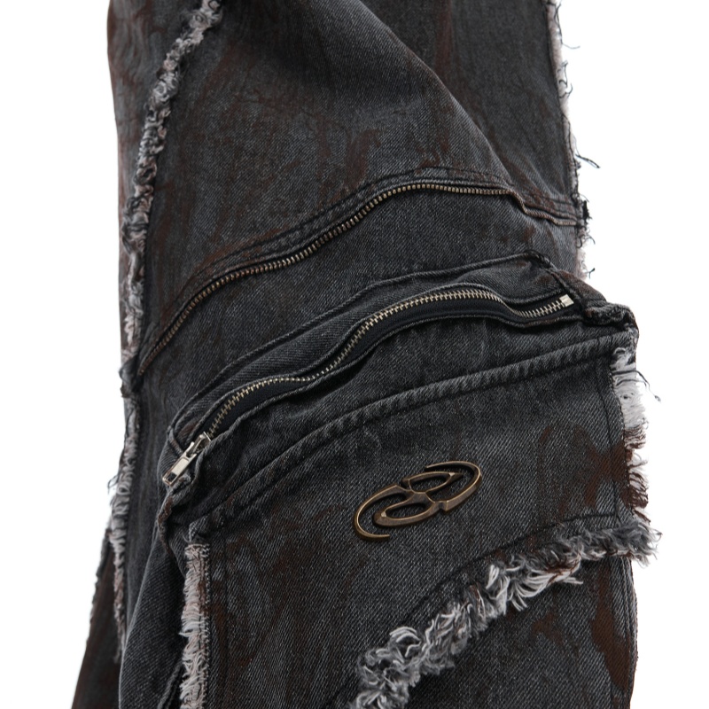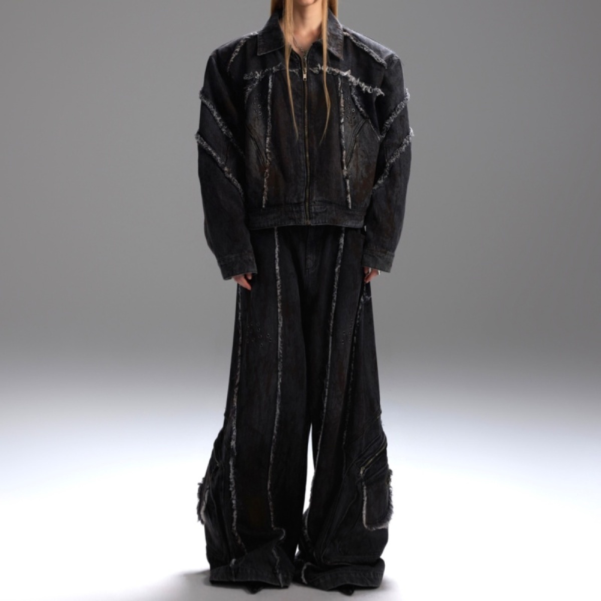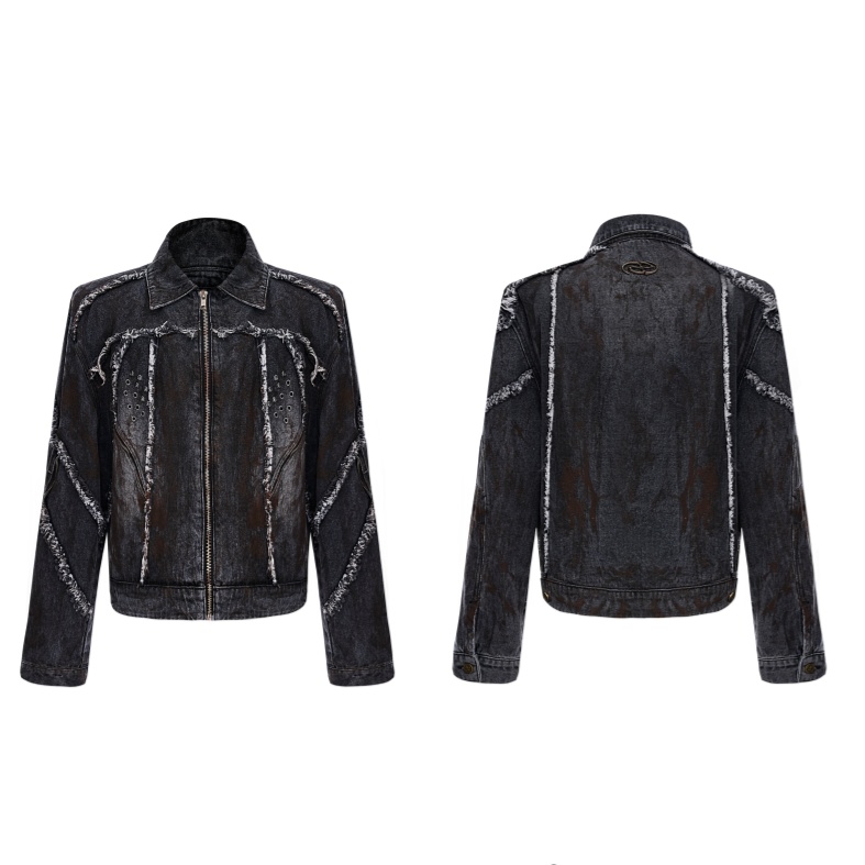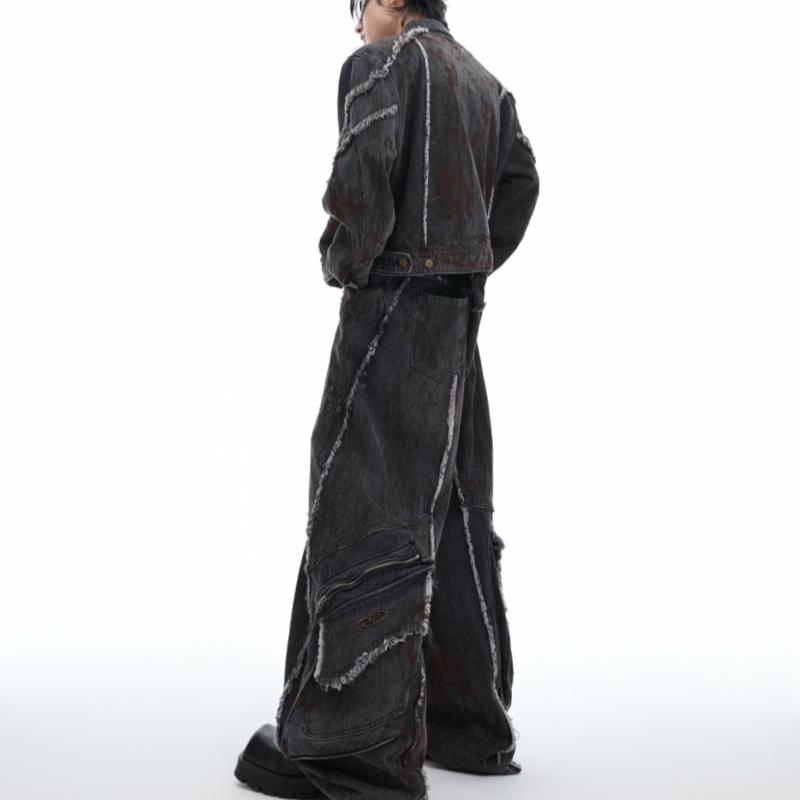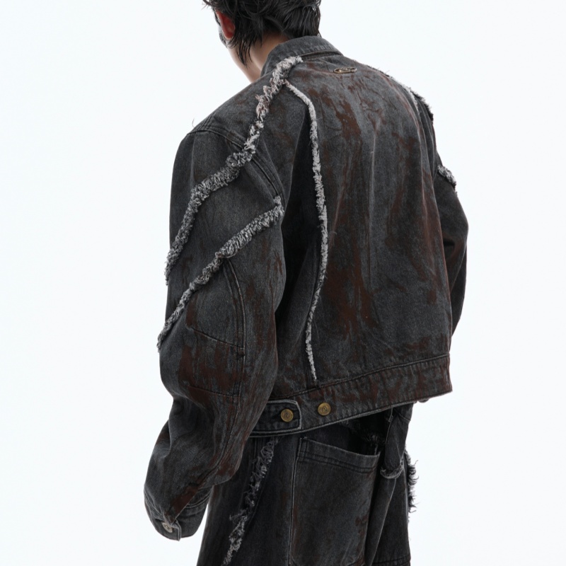 Raw Edge Splash-dyeing Distressed Padded Shoulder Denim Coat