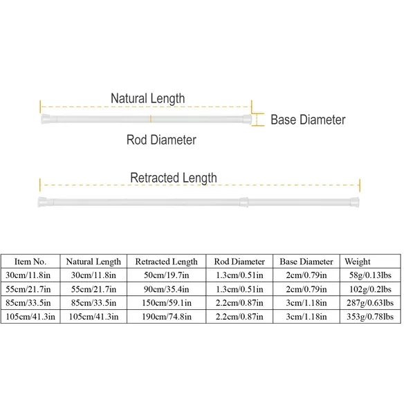 *Strong Spring Load*:Built-in high elastic and durable spring,which provides strong tension between walls and allows the curtain rod to hold 2-3kg/4.4-6.6lbs-Weight objects(Note:Its load capacity is also relevant to the diameter and the length of the rod. Generally speaking,the larger its diameter is and the shorter its length is,the better its load carrying capacity will be.)