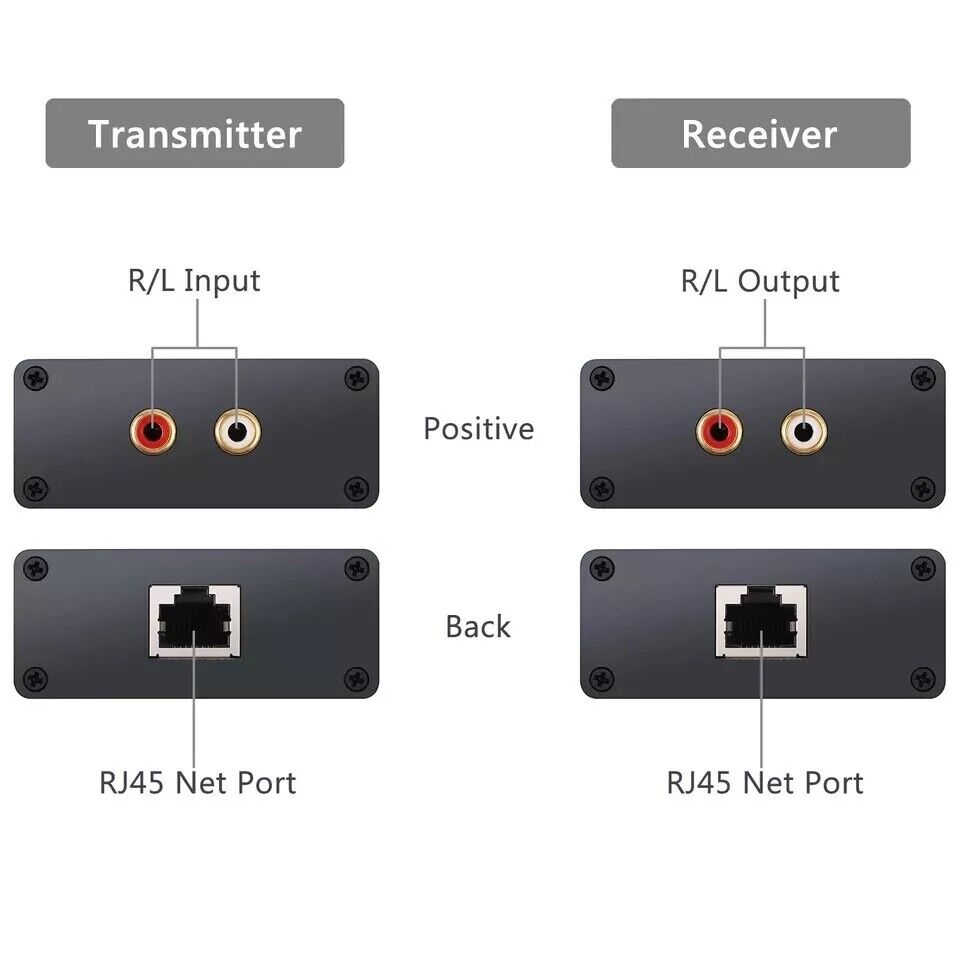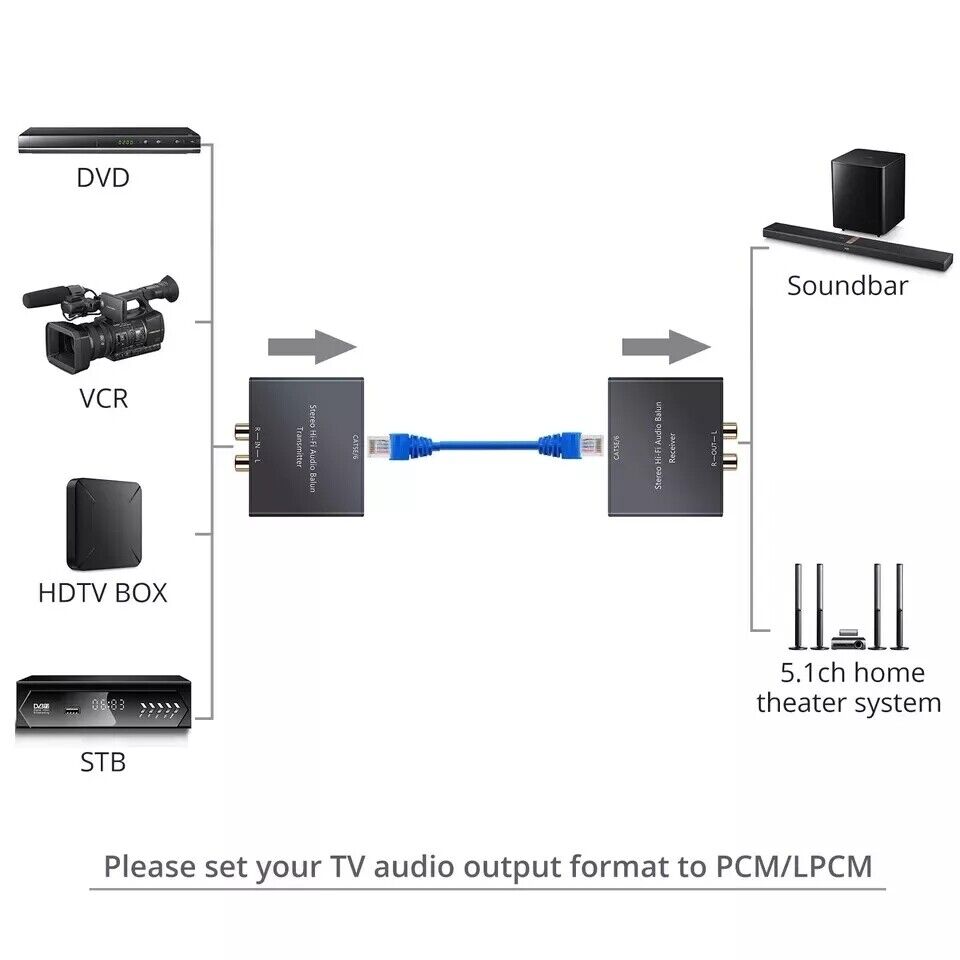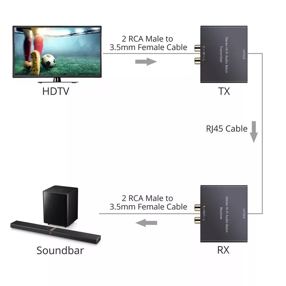 Plug the Left (White) and Right (Red) stereo audioRCA connectors of the transmission Balun into the HI-FI audio output of thesource component, Plug the Left(White) and Right(Red) RCA connectors from theReceive Balun into your desired input component. Insert the CAT5 cable intoboth ends of the Baluns. You may use standard EIA 568A/B Termination.