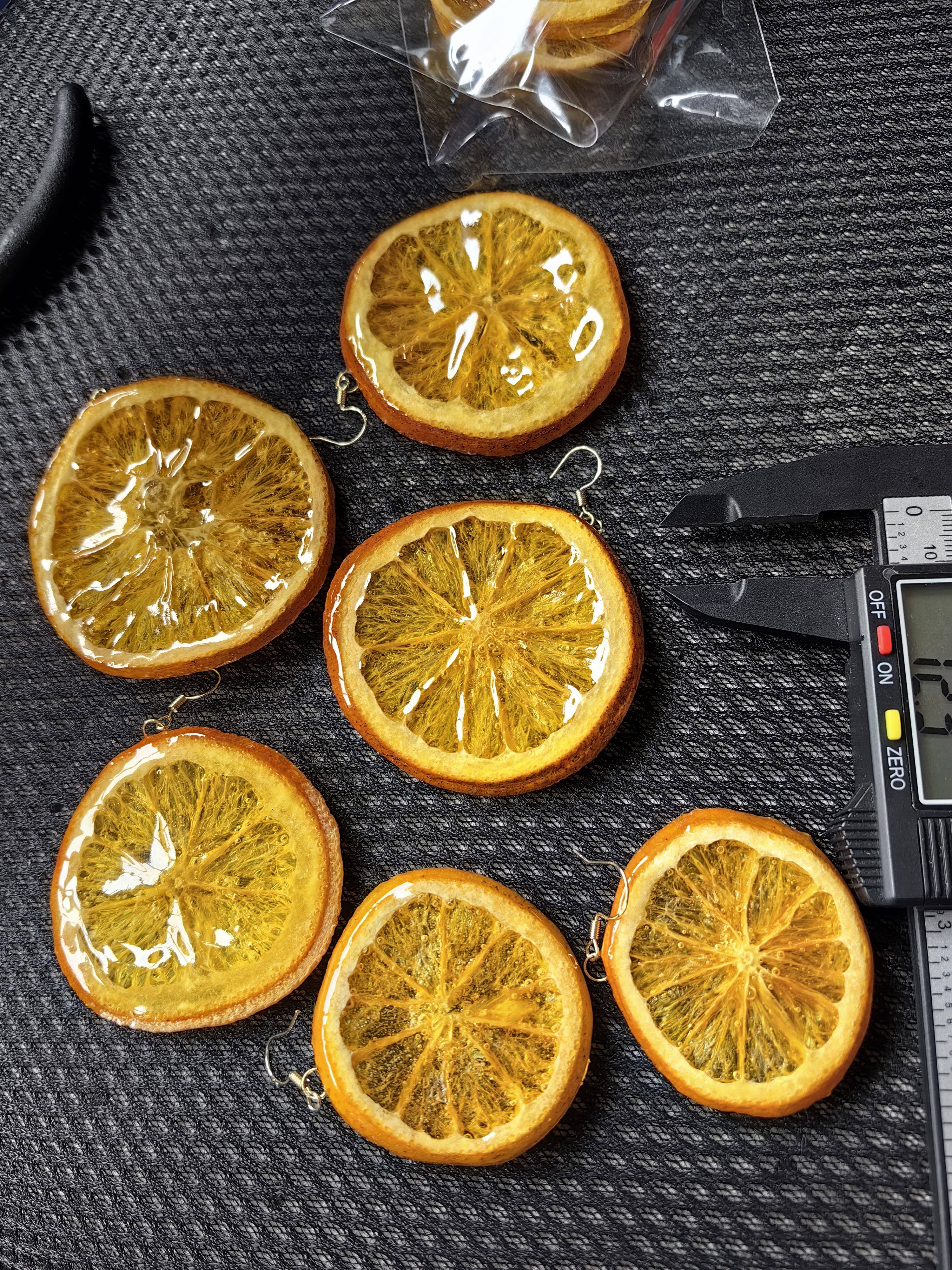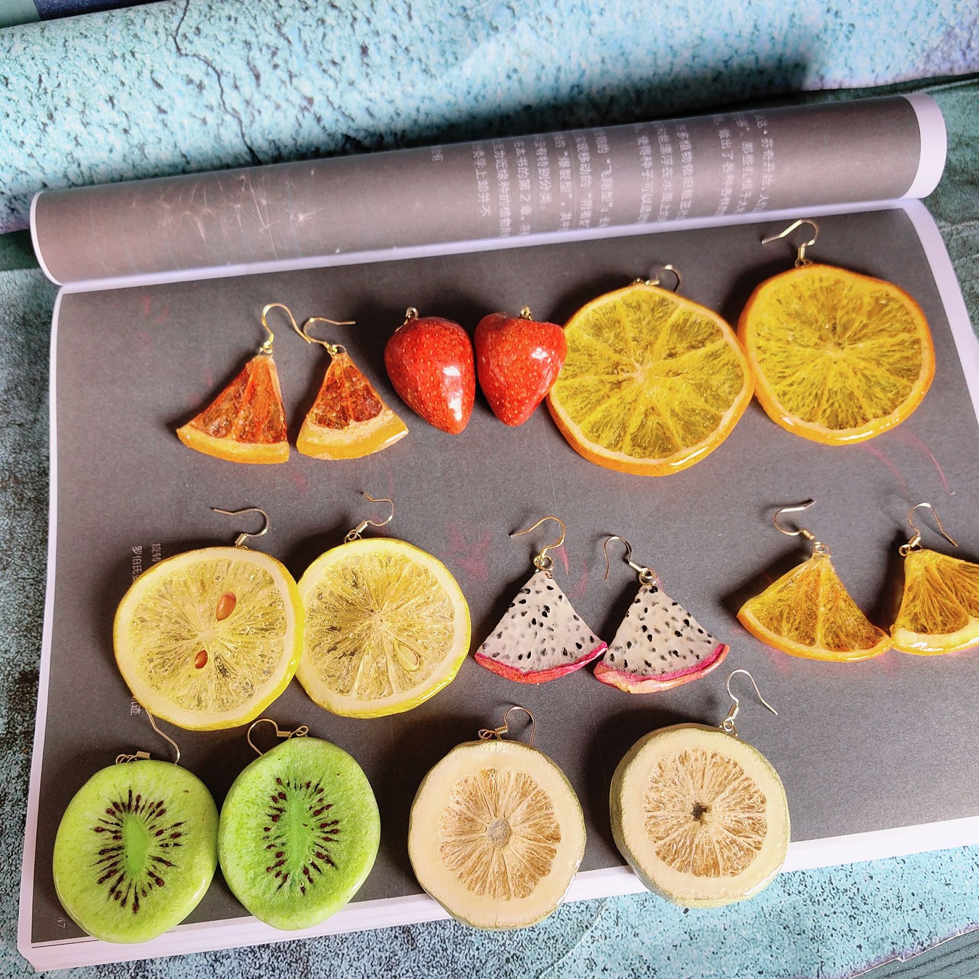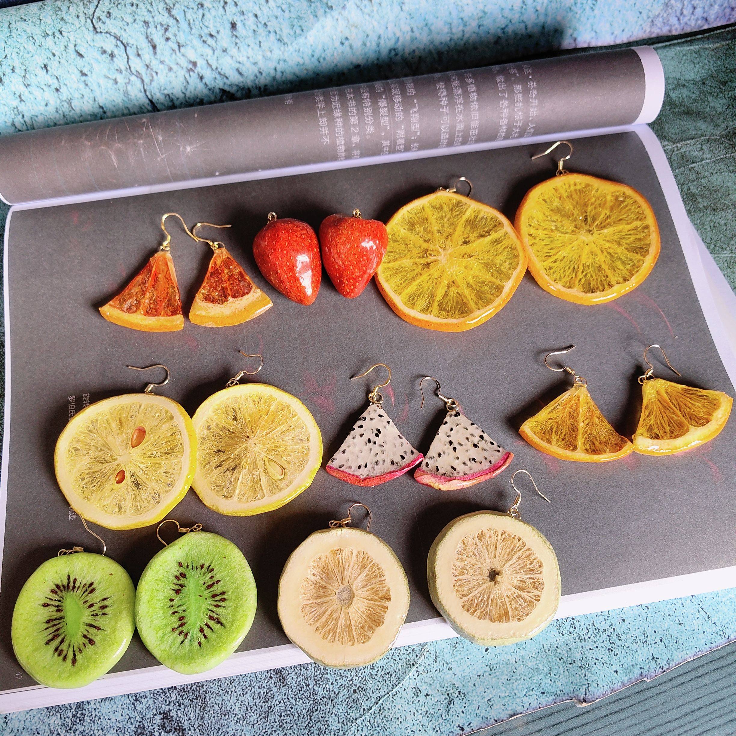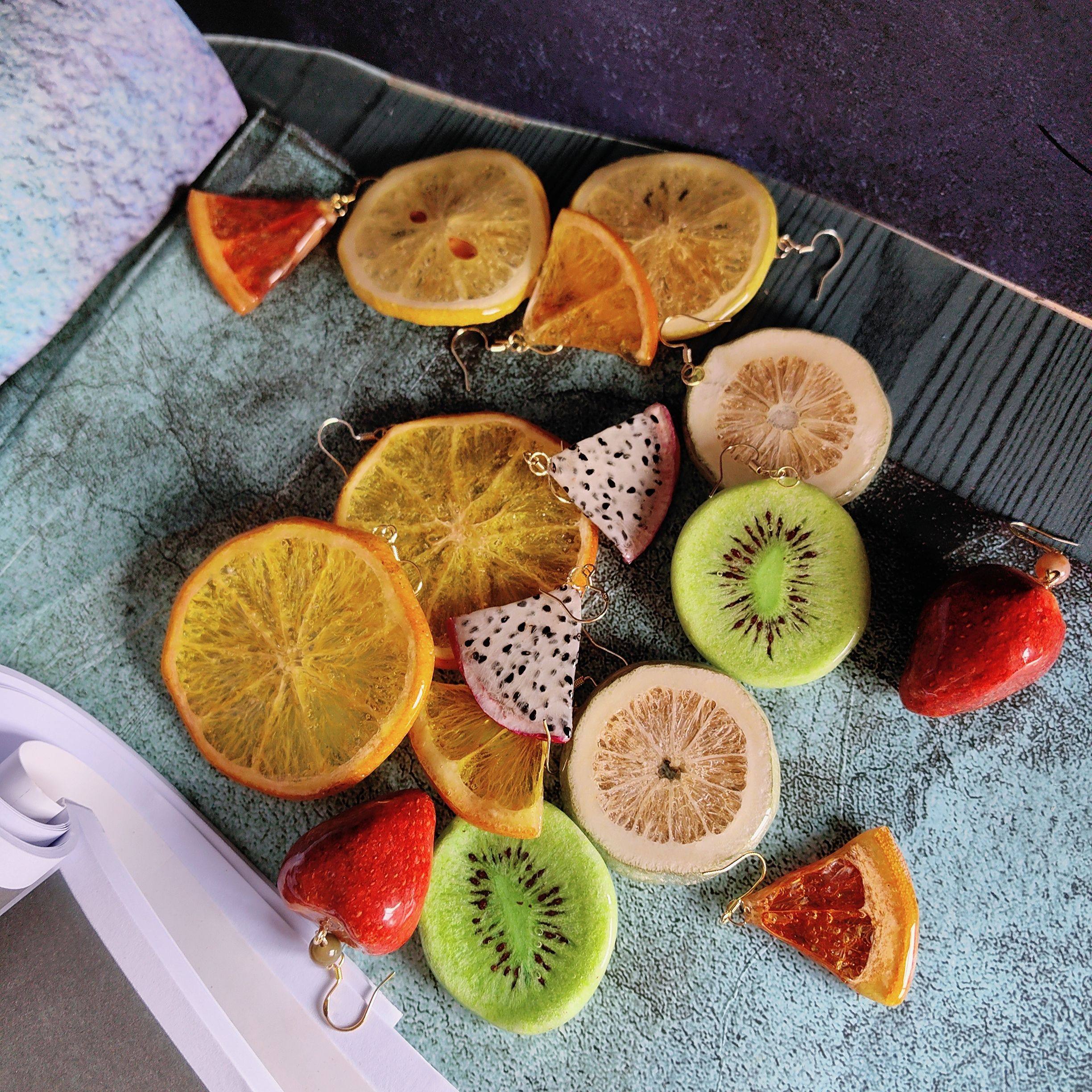Colors: Dragon Fruit No. 1 (about 4 cm wide, about 3 mm thick), Gradient Blood Orange (about 3 cm wide, about 5 mm thick), Large Orange (about 6.5 cm in diameter, about 6.5 mm thick), Sliced Orange—paired 14k copper-plated gold ear hooks (about 4 mm thick), Irregular Small Orange (about 5 cm wide, about 6.5 mm thick), Small Lemon (about 5 cm wide, about 9 mm thick), Blood Orange, Red-Fleshed Dragon Fruit, Key Lime, Grapefruit