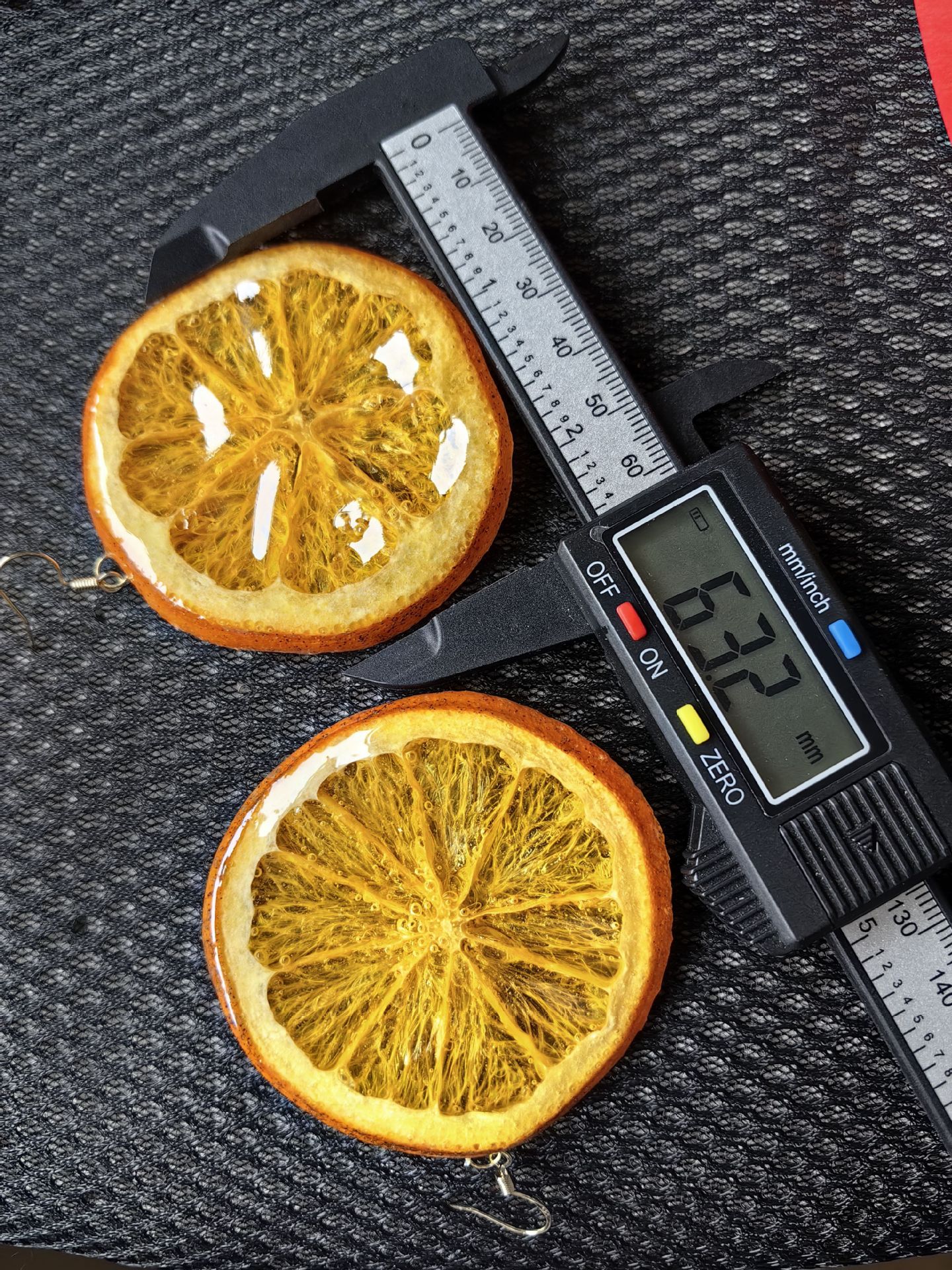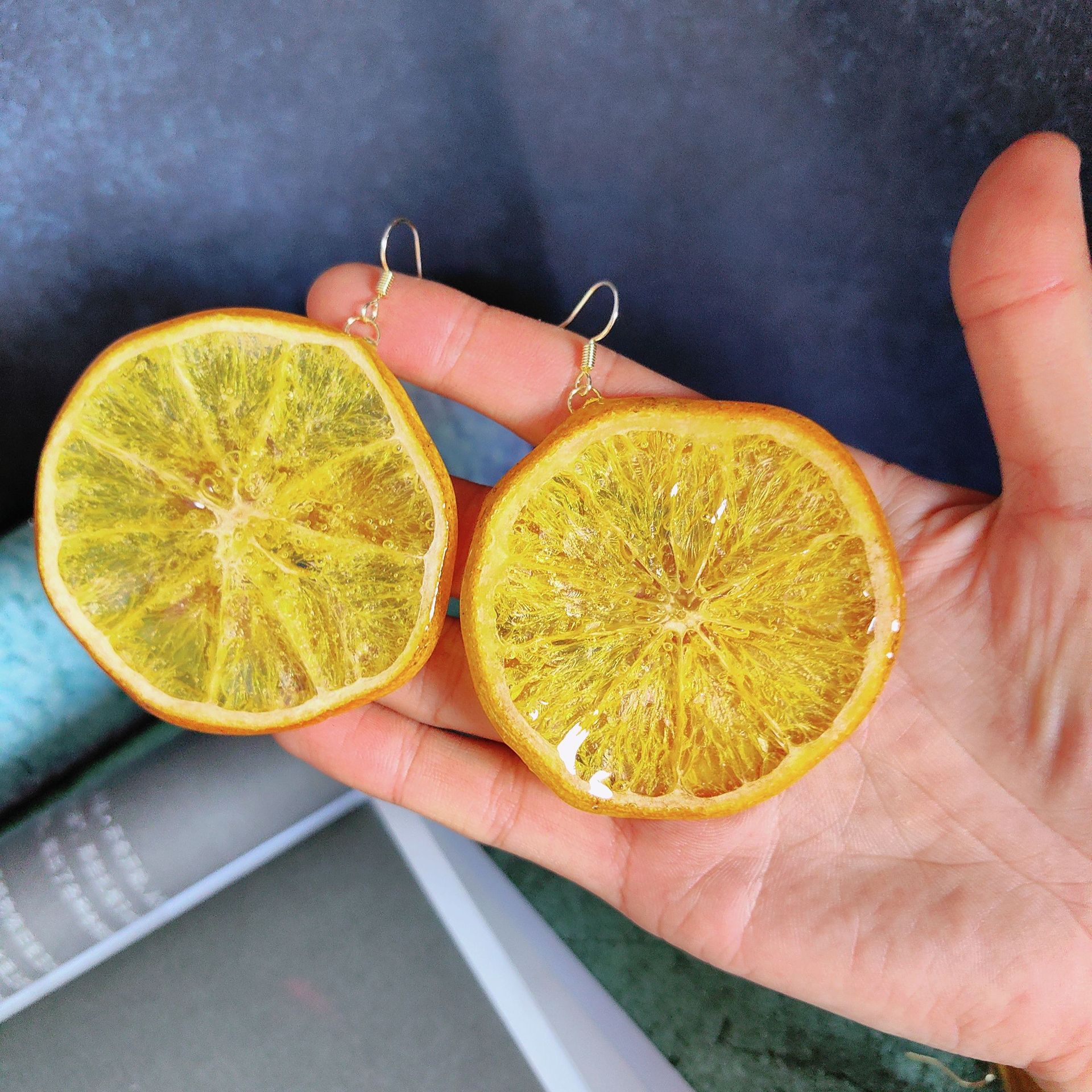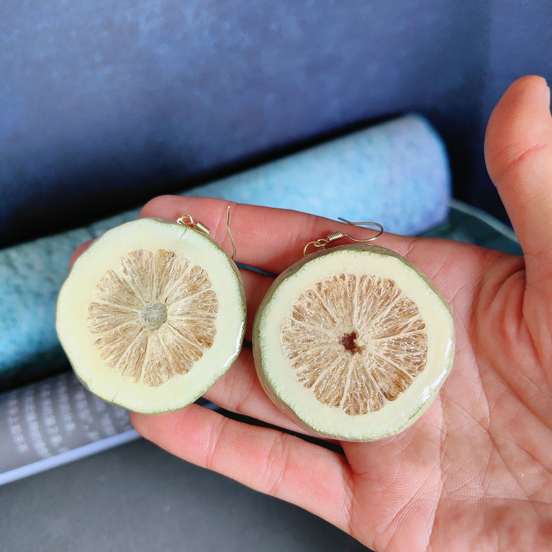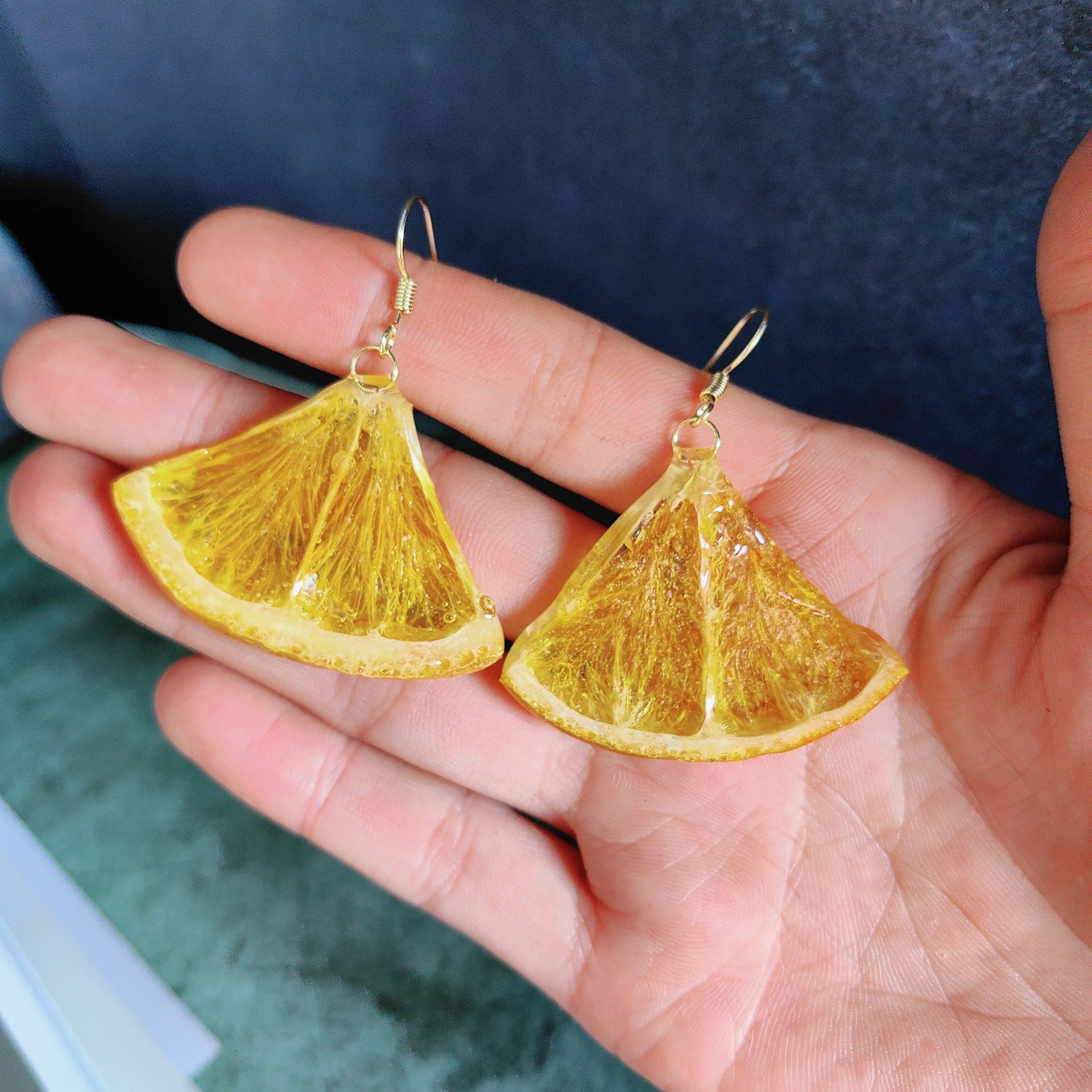 Colors: Dragon Fruit No. 1 (about 4 cm wide, about 3 mm thick), Gradient Blood Orange (about 3 cm wide, about 5 mm thick), Large Orange (about 6.5 cm in diameter, about 6.5 mm thick), Sliced Orange—paired 14k copper-plated gold ear hooks (about 4 mm thick), Irregular Small Orange (about 5 cm wide, about 6.5 mm thick), Small Lemon (about 5 cm wide, about 9 mm thick), Blood Orange, Red-Fleshed Dragon Fruit, Key Lime, Grapefruit