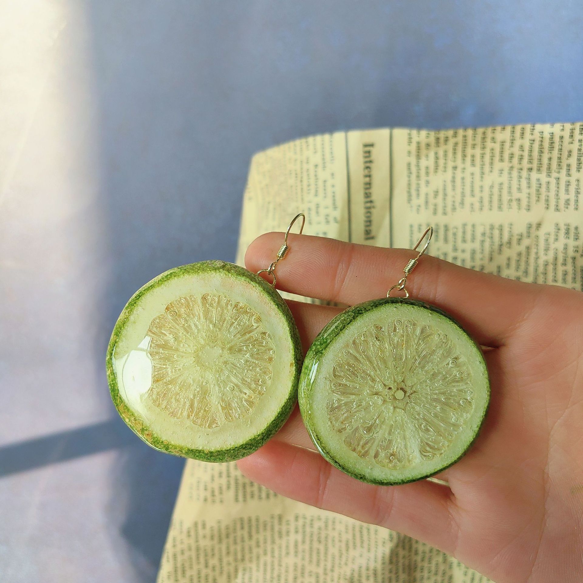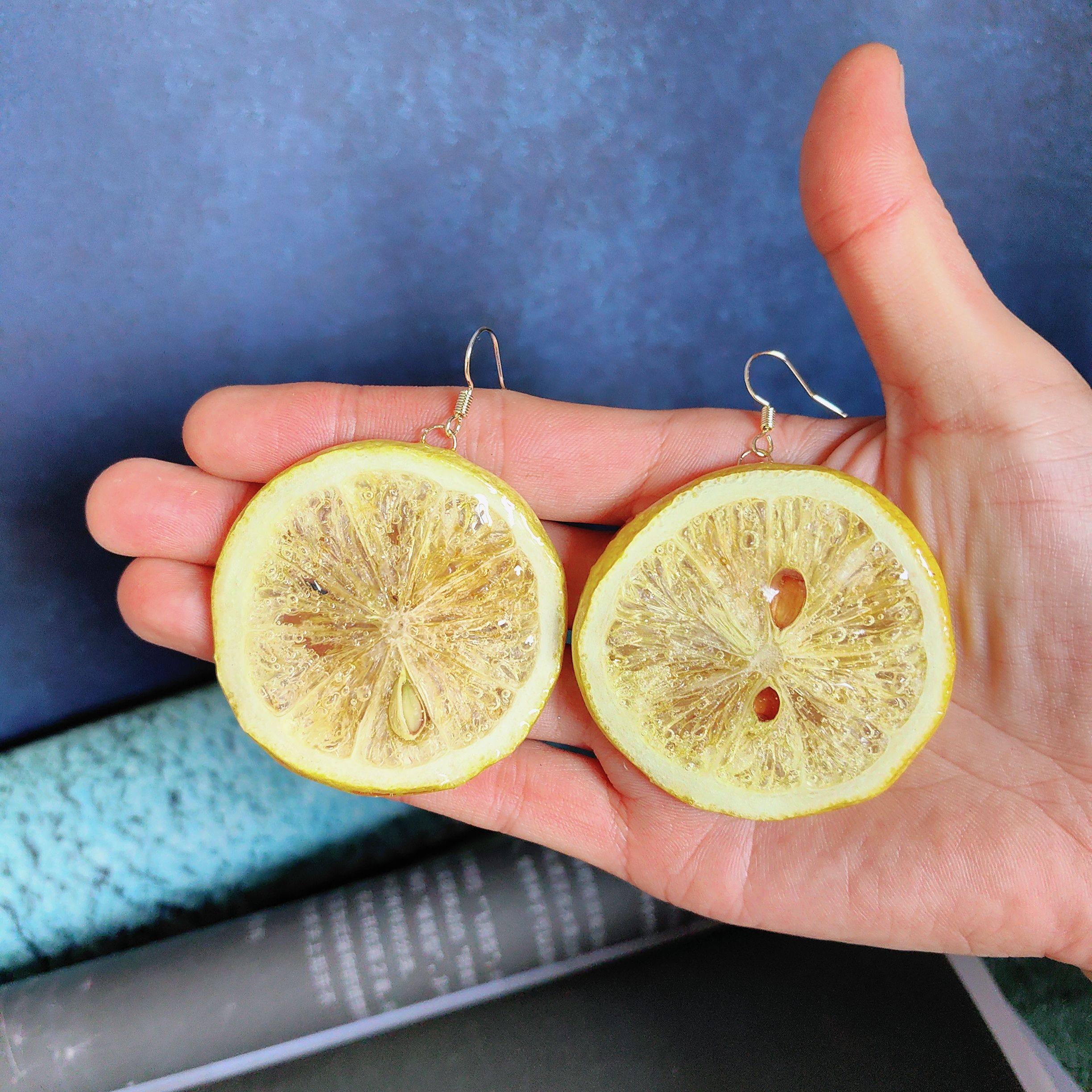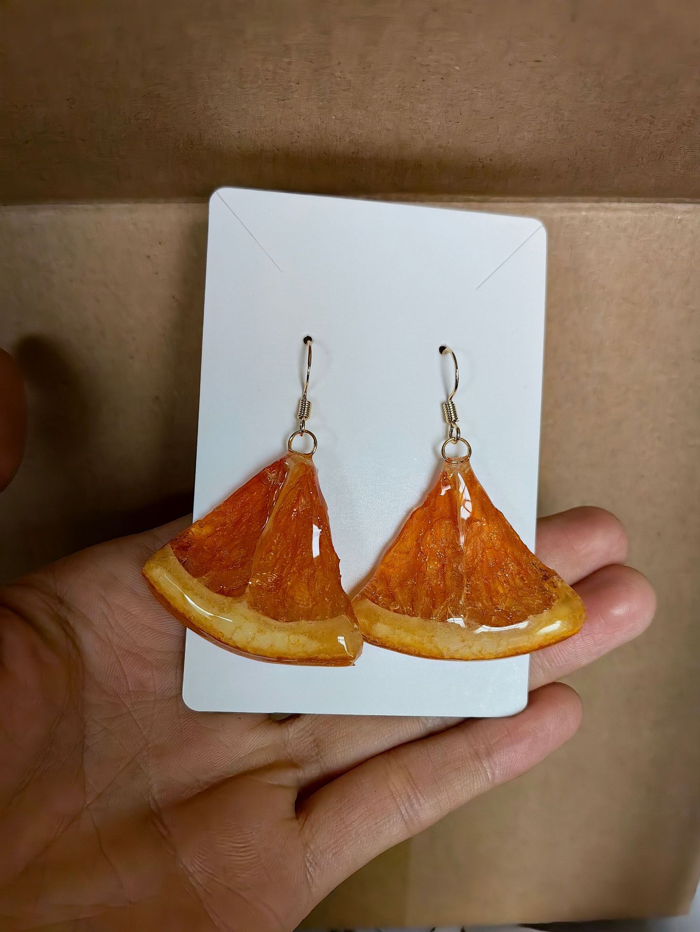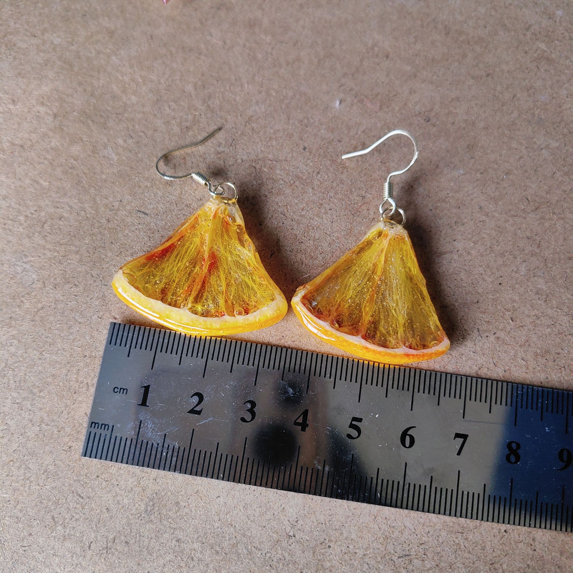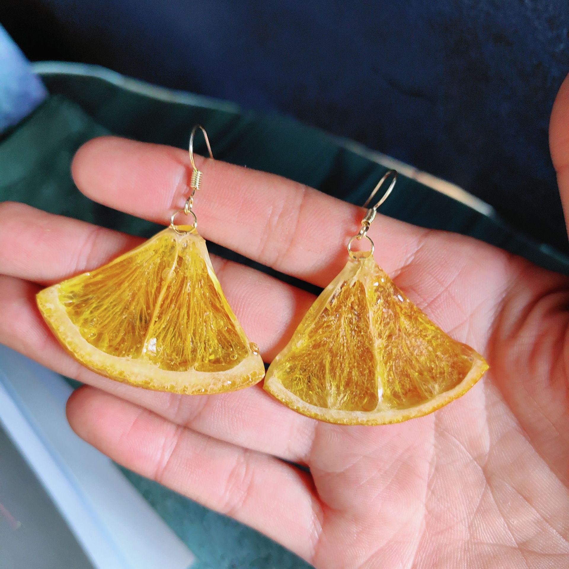Colors: Dragon Fruit No. 1 (about 4 cm wide, about 3 mm thick), Gradient Blood Orange (about 3 cm wide, about 5 mm thick), Large Orange (about 6.5 cm in diameter, about 6.5 mm thick), Sliced Orange—paired 14k copper-plated gold ear hooks (about 4 mm thick), Irregular Small Orange (about 5 cm wide, about 6.5 mm thick), Small Lemon (about 5 cm wide, about 9 mm thick), Blood Orange, Red-Fleshed Dragon Fruit, Key Lime, Grapefruit