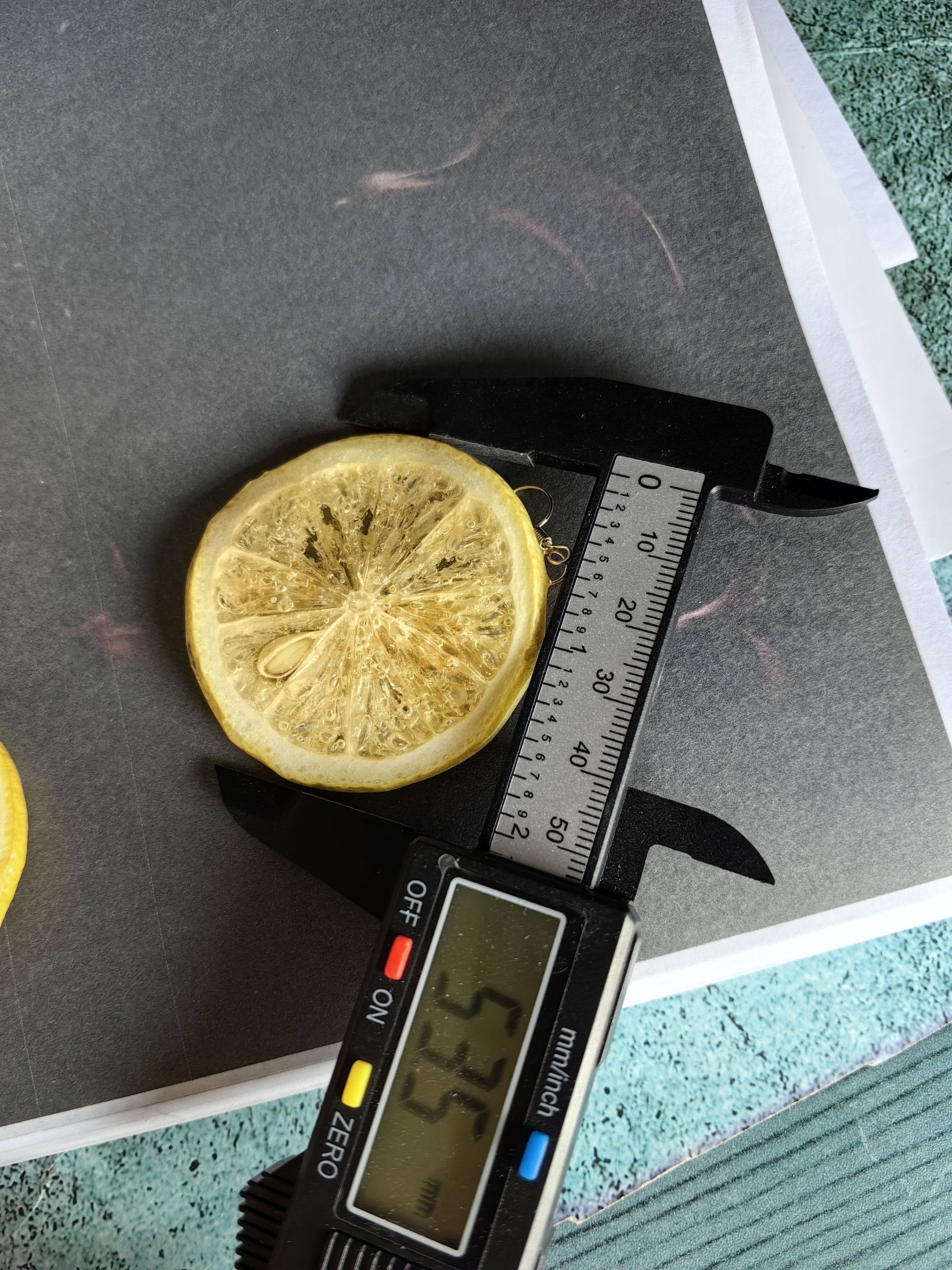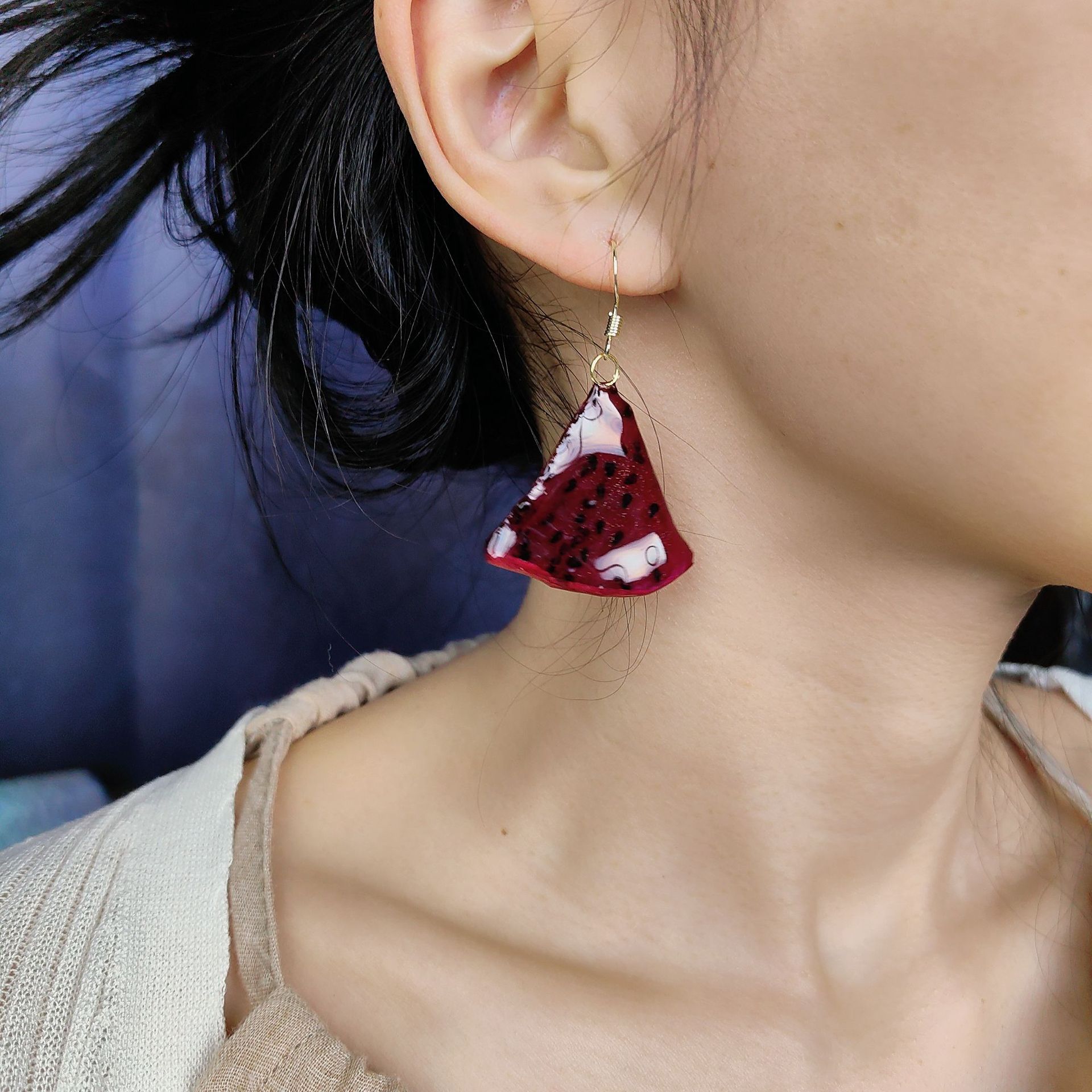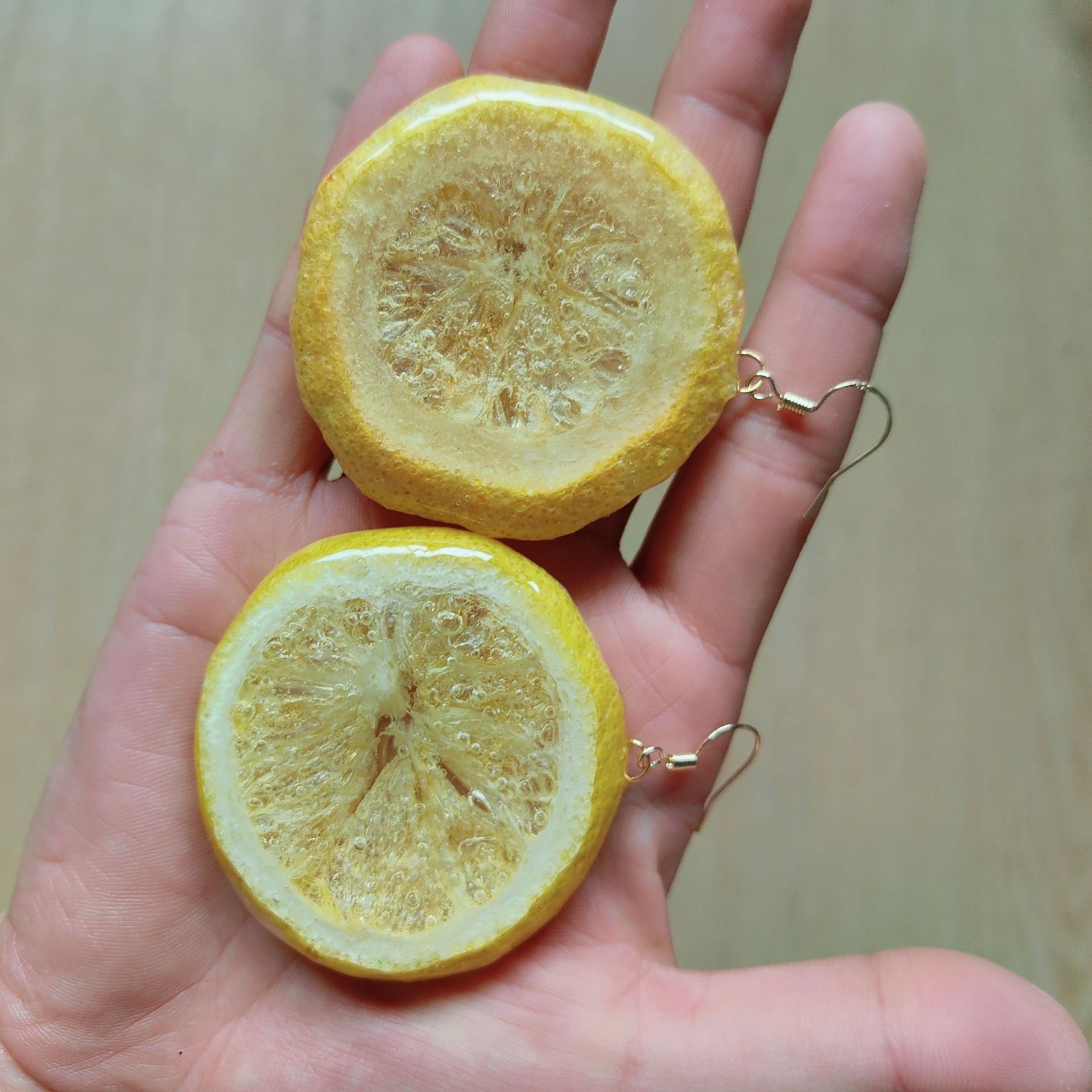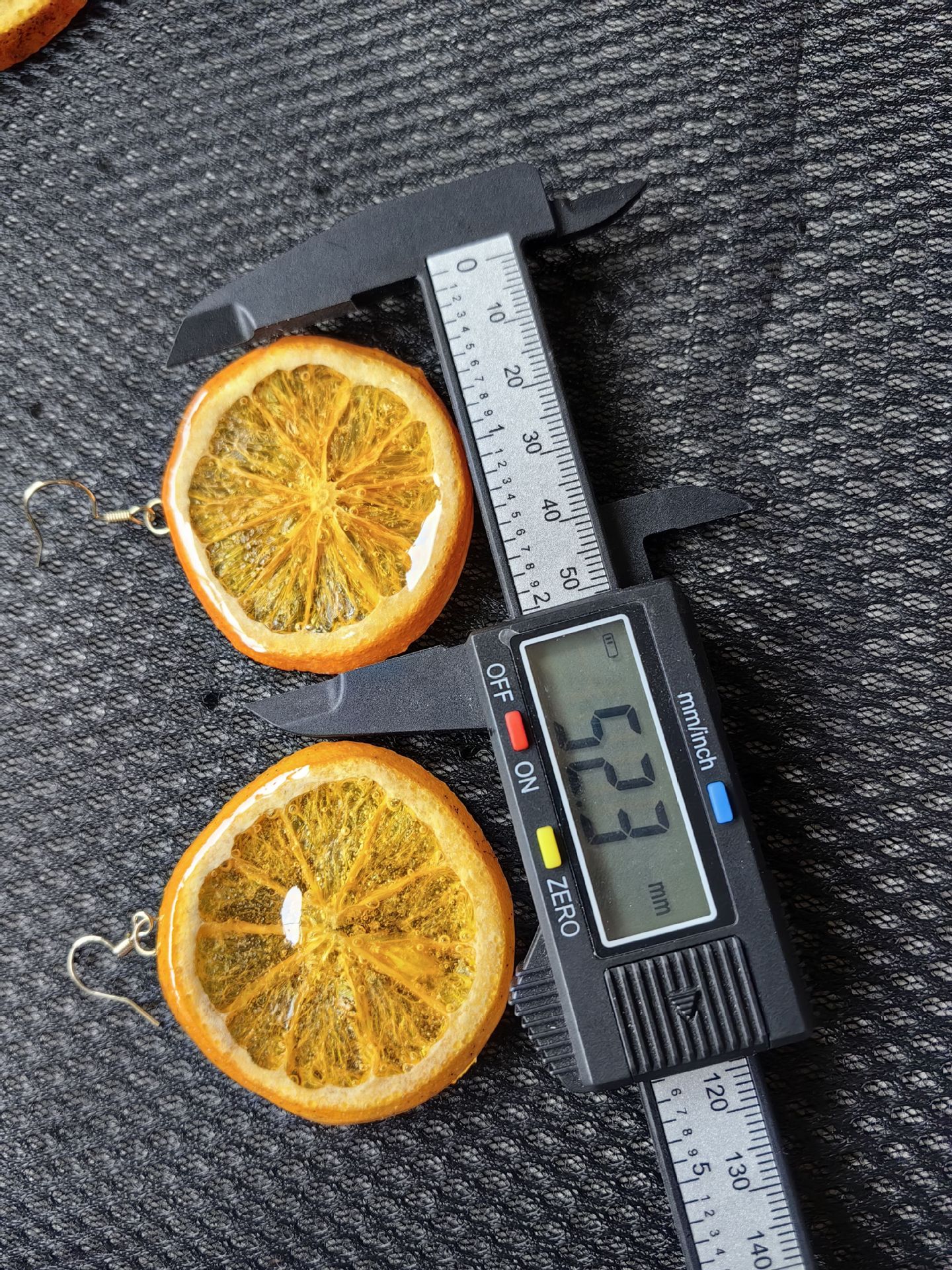 Colors: Dragon Fruit No. 1 (about 4 cm wide, about 3 mm thick), Gradient Blood Orange (about 3 cm wide, about 5 mm thick), Large Orange (about 6.5 cm in diameter, about 6.5 mm thick), Sliced Orange—paired 14k copper-plated gold ear hooks (about 4 mm thick), Irregular Small Orange (about 5 cm wide, about 6.5 mm thick), Small Lemon (about 5 cm wide, about 9 mm thick), Blood Orange, Red-Fleshed Dragon Fruit, Key Lime, Grapefruit