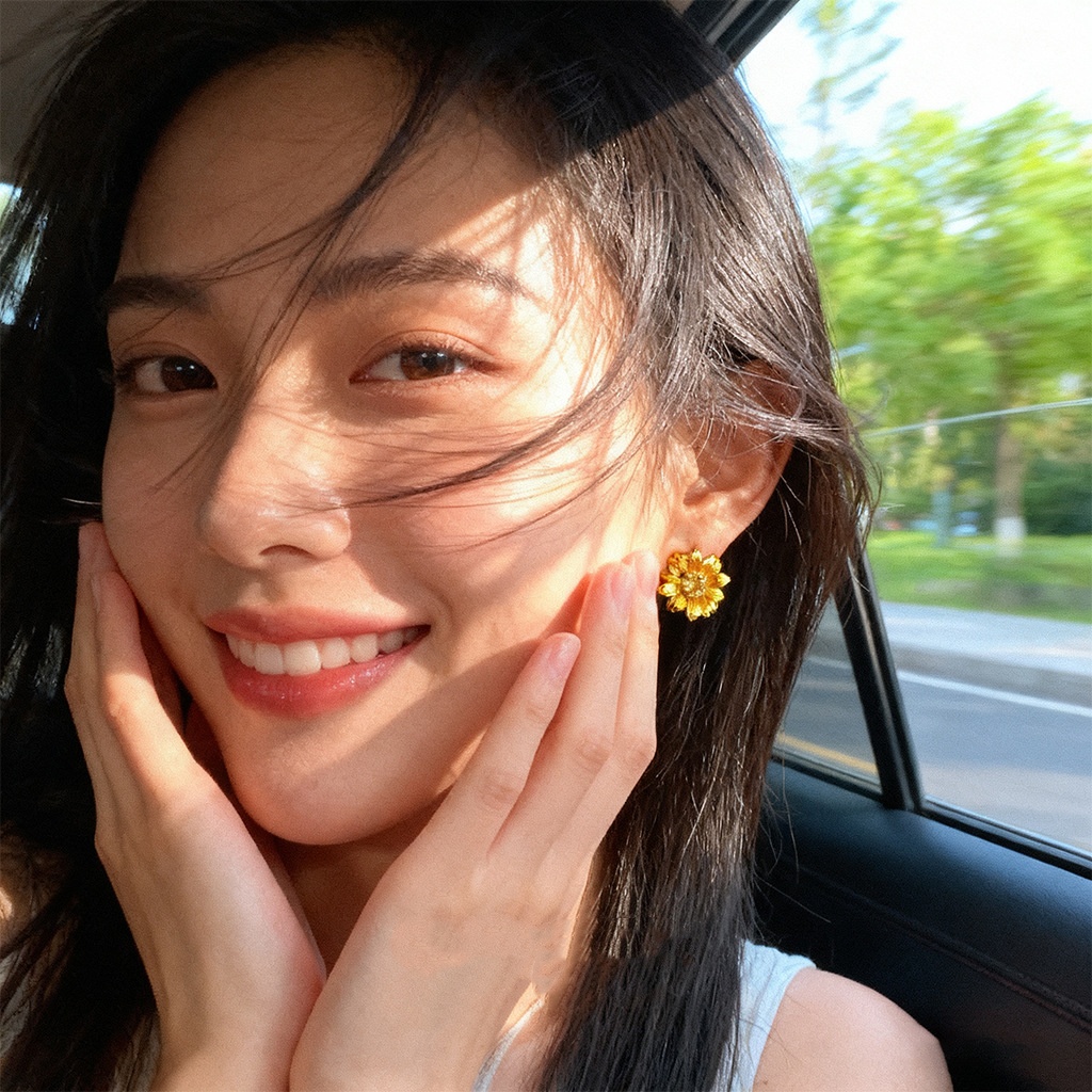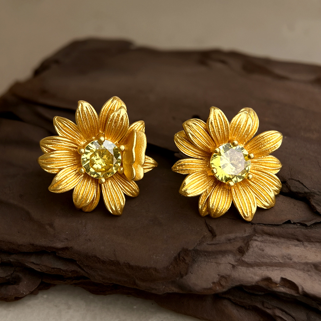 Real Gold Sunflower Flower Zircon Earrings