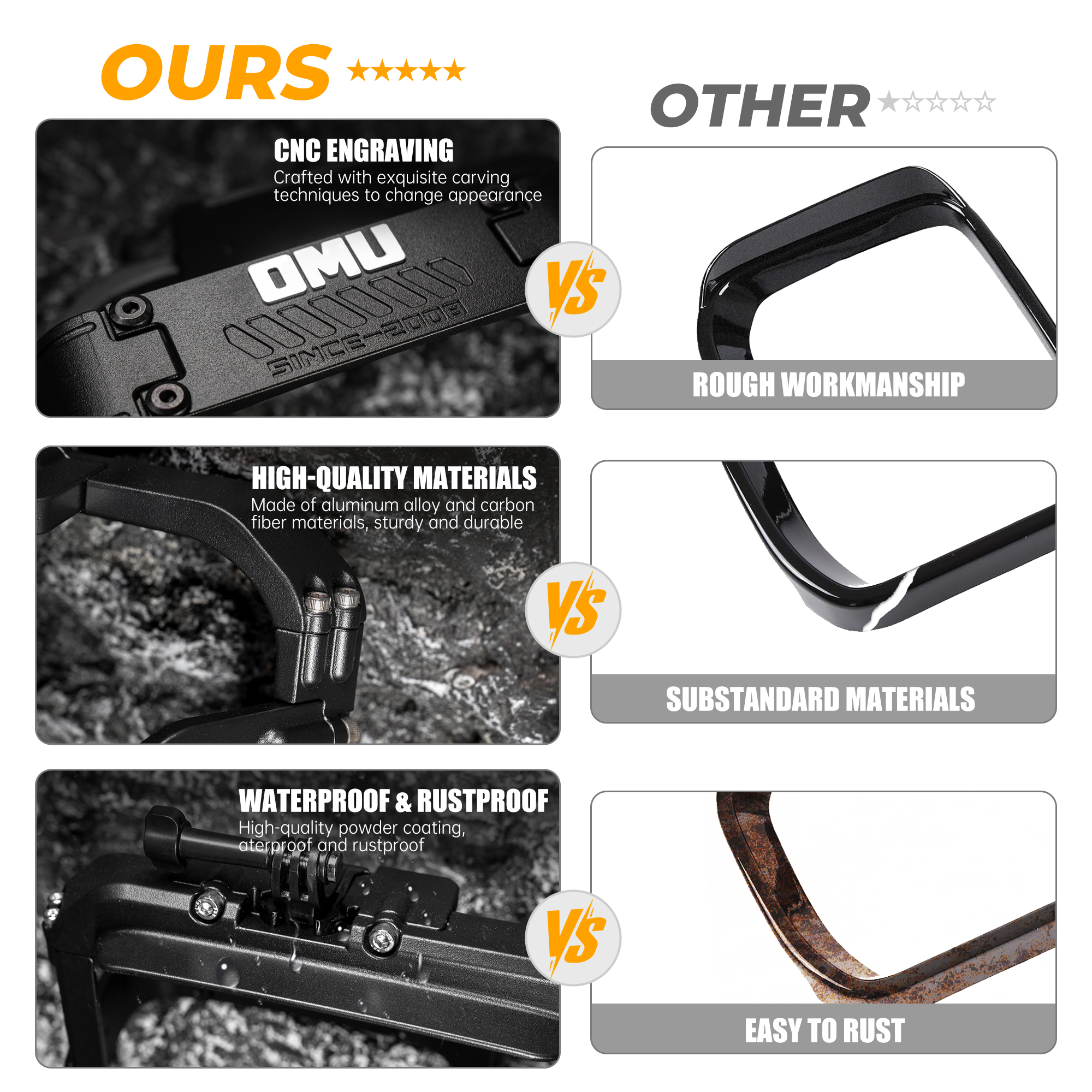 ALUMINUM ALLOY BODY, STURDY AND DURABLE: The main body of the rearview mirror rain shield is made of high-quality aluminum alloy material, which has excellent strength and corrosion resistance, and can withstand the challenges of harsh weather and off-road environments, ensuring long-term stable performance.