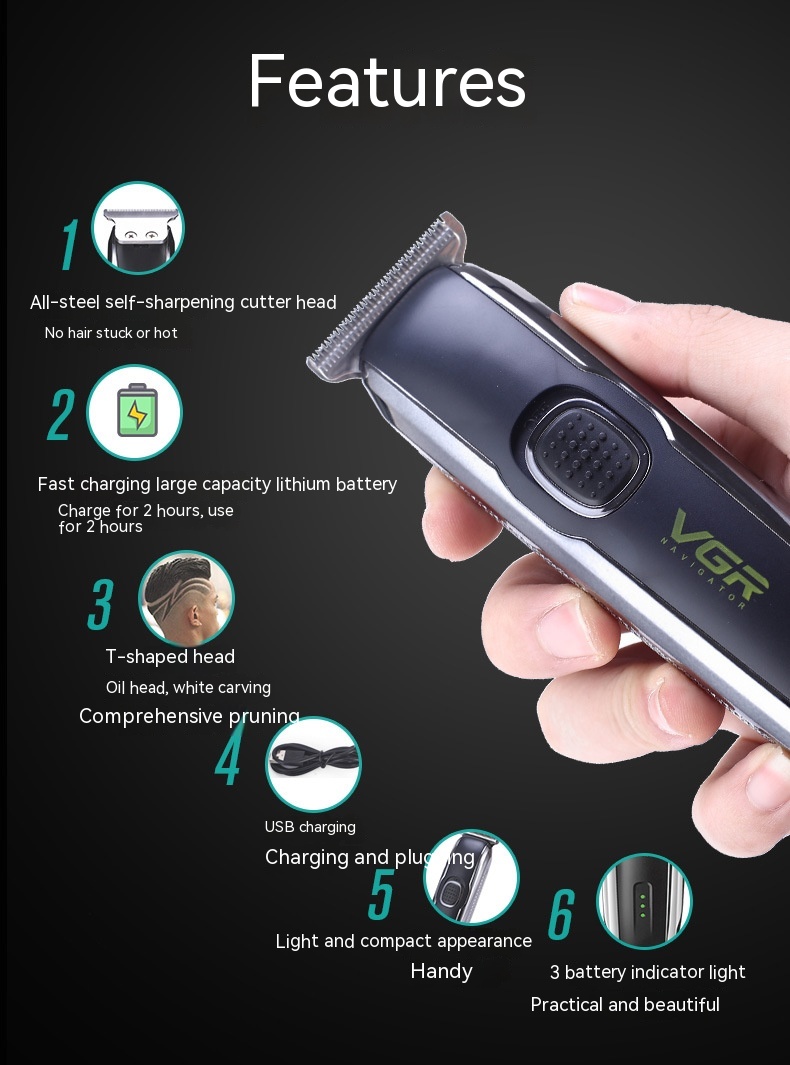 Accessories: USB charging cable, 3 limit combs (1/2/3MM), maintenance solution