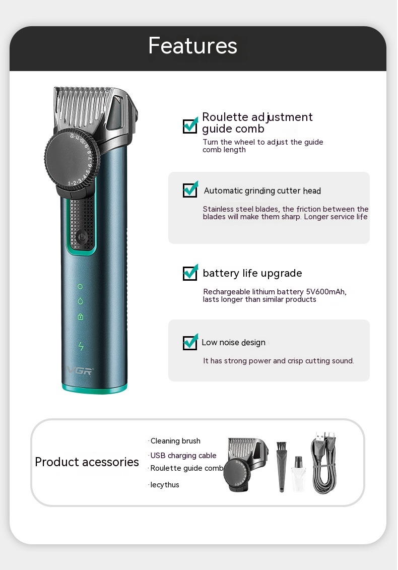 Razor, disc adjustment guide comb, lubricating oil, charging cable, cleaning brush, instruction manual