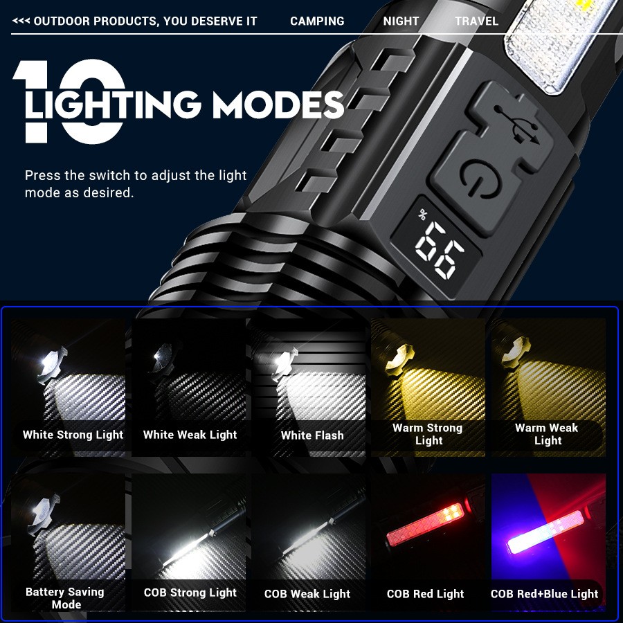【7 Modes 】 3 main light modes, click the switch to give (①super bright / ②medium bright / ③flashing). 4 side lights modes, long press the switch to give (④super bright / ⑤medium bright / ⑥red / ⑦red and blue flashing). The flashlight can be turned off directly after 10 seconds of operation in any mode, without going through all modes.