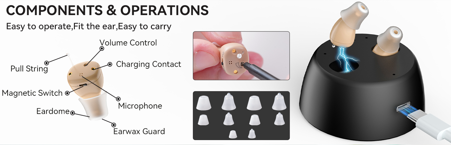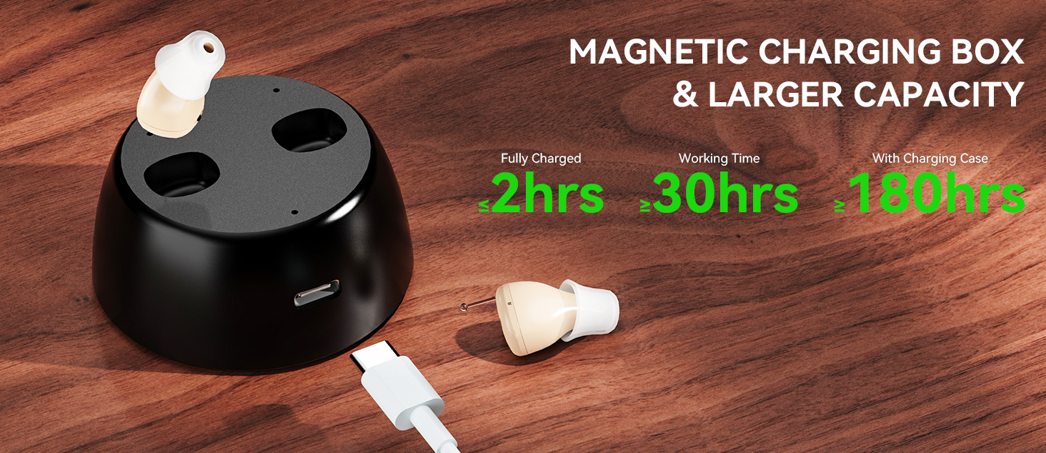 No need to replace batteries. These rechargeable hearing aids for seniors come with a magnetic USB charging dock. A full charge takes just 2-3 hours and provides up to 30 hours of continuous use—perfect for all-day comfort and performance.