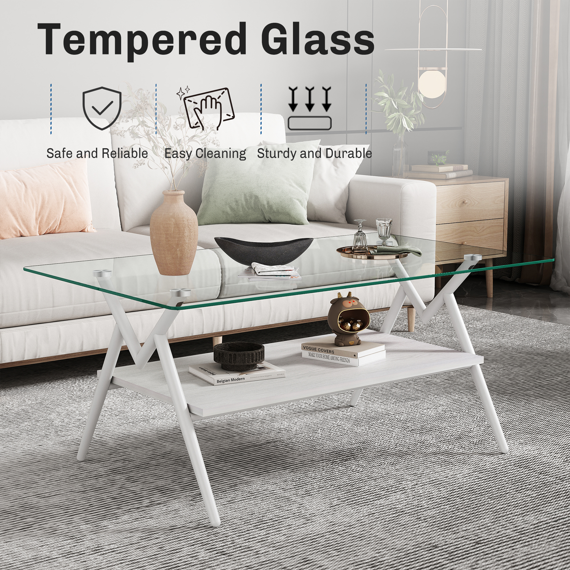 Product Name:Rectangle Coffee Table with Tempered Glass top and White Metal Legs, Modern Table for Living Room , Transparent Glass