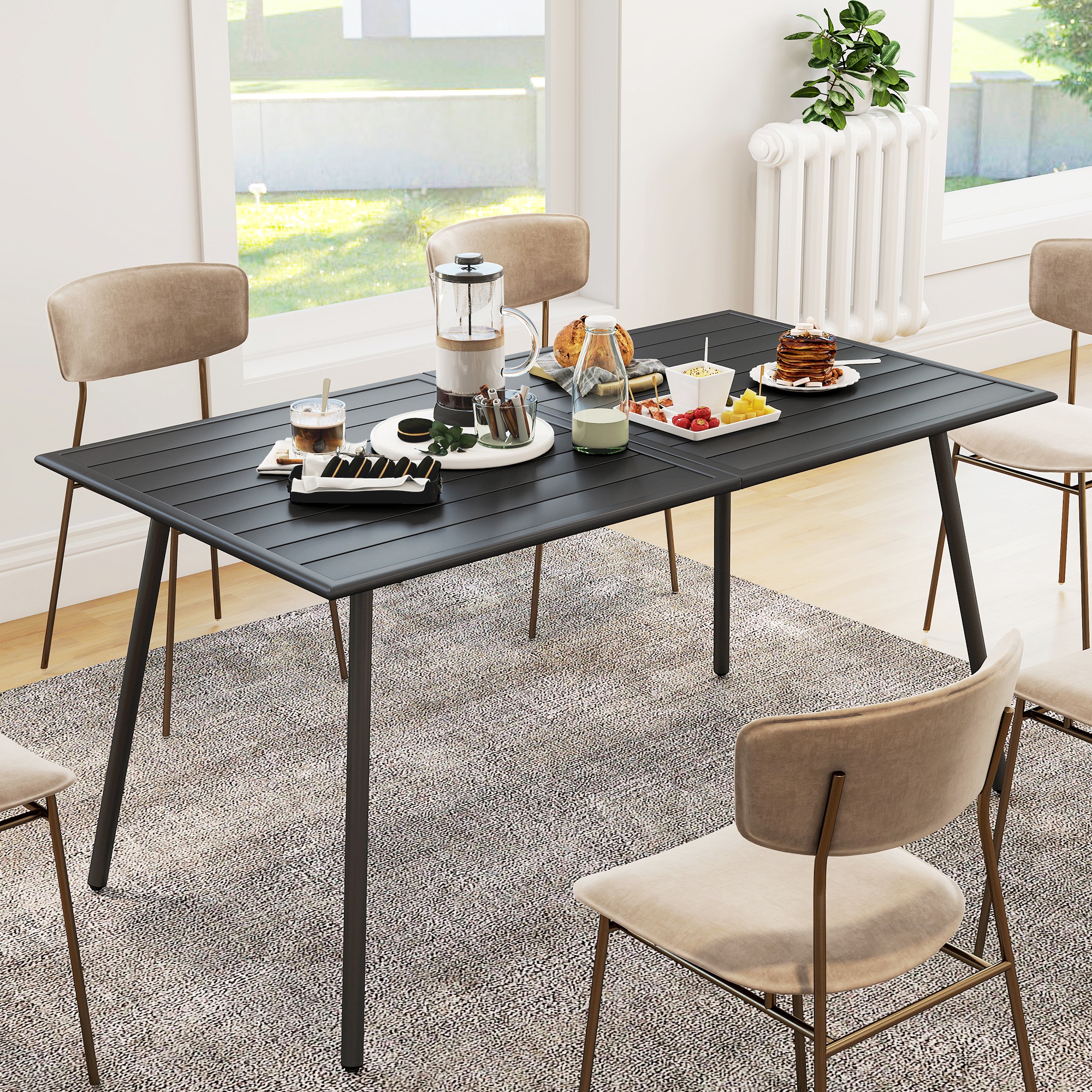 Transform your garden gatherings with the garden table, designed to comfortably seat six. The slat-style tabletop prevents water build-up and simplifies cleaning, while the rust-proof powder-coated steel frame ensures longevity. Its chic, simple design complements any garden decor, making it a stylish addition to your patio or outdoor dining space.