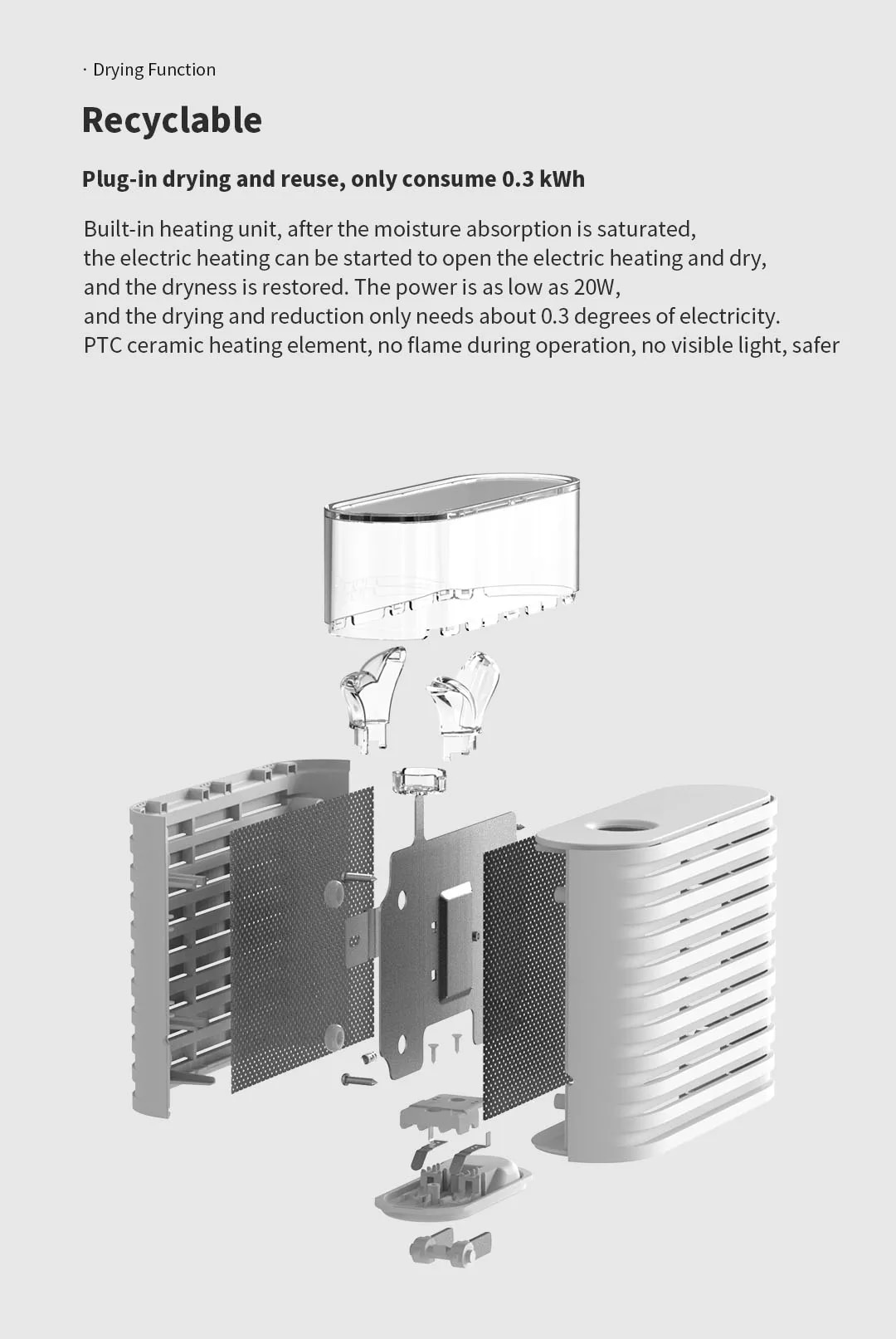 【Recyclable】Built-in heating unit, after the moisture absorption is saturated, the electric heating can be started to open the electric heating and dry, and the dryness is restored. The power is as low as 20W, and the drying and reduction only need about 0.3 degrees of electricity. PTC ceramic heating element, no flame during operation, no visible light, safer.
