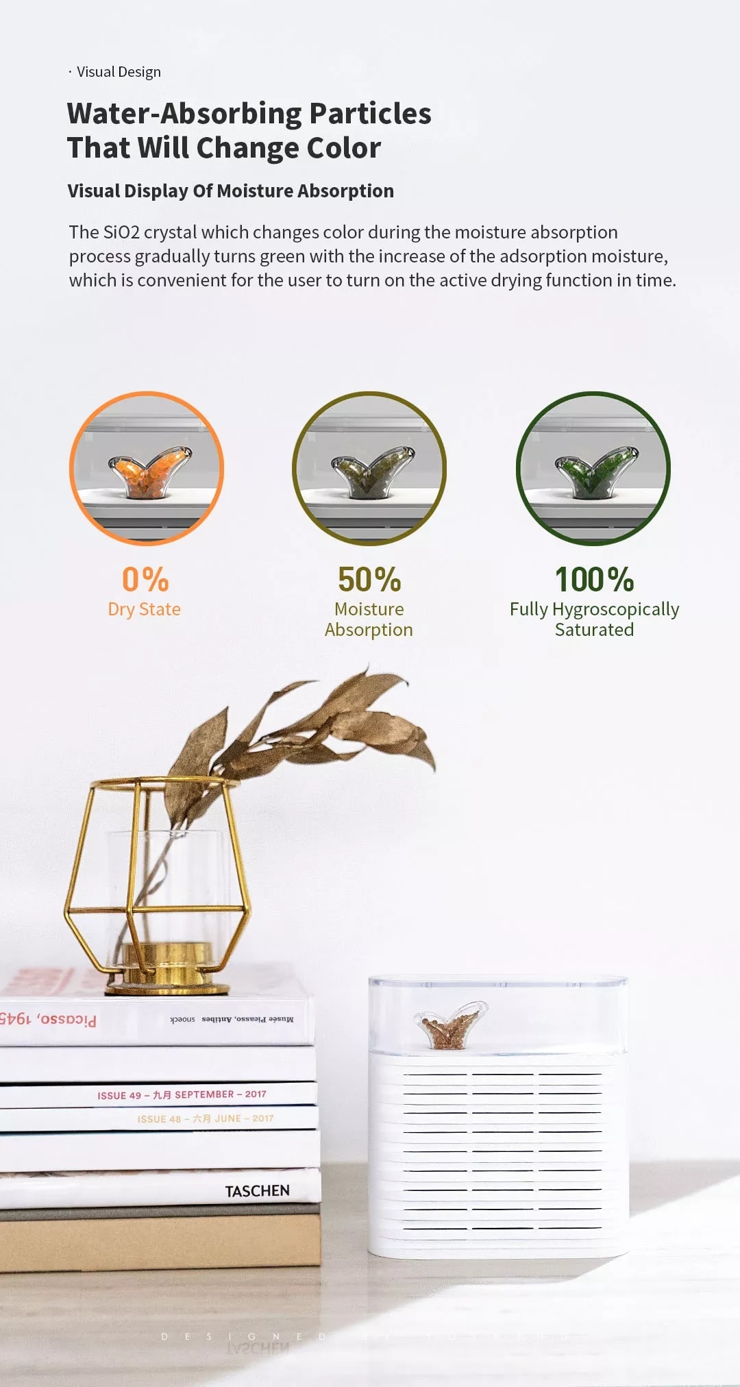 【Water-Absorbing Particles That Will Change Color】SiO2 Particles, Safe And Convenient Dehumidification. The SiO2 crystal which changes color during the moisture absorption process gradually turns green with the increase of the adsorption moisture, which is convenient for the user to turn on the active drying function in time.