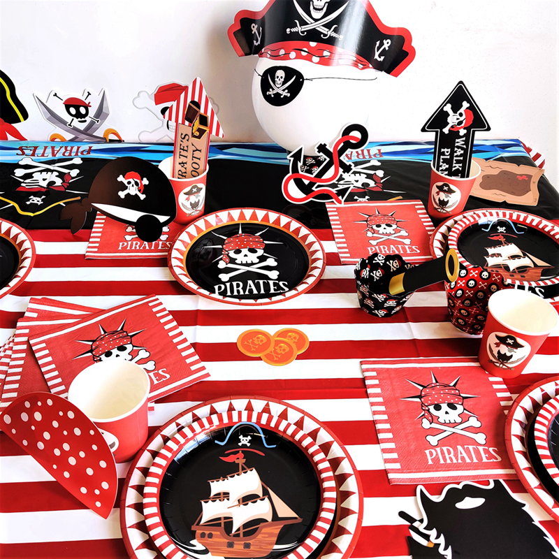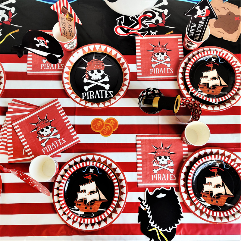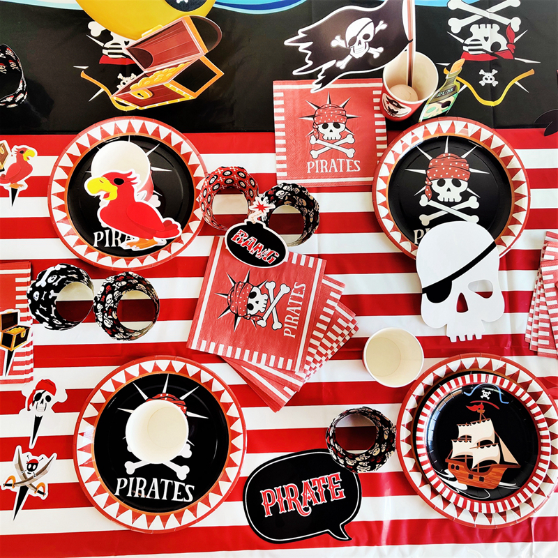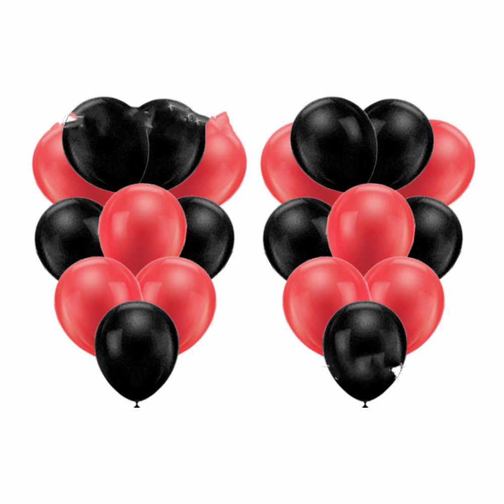 Color: 8 7-inches, 8 9-inches, 20 tissues, 8 paper cups, 25 straws a pack, 4-piece set, 8 knives, forks and spoons, 20 red + black balloons, tablecloth
