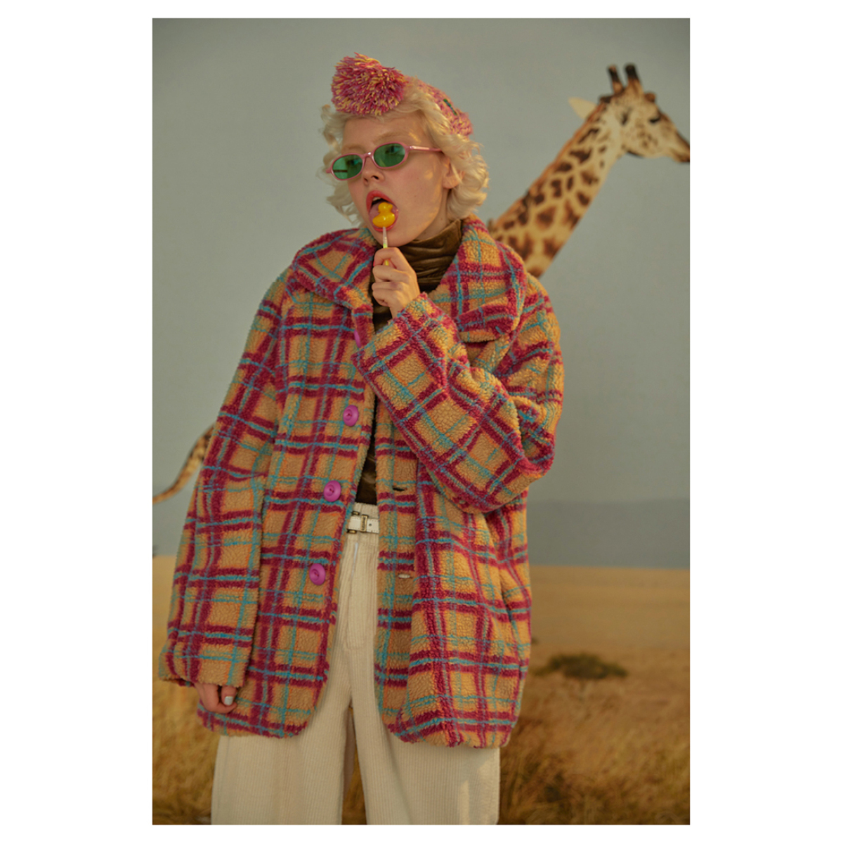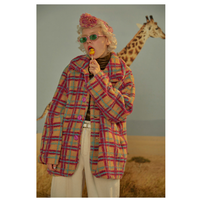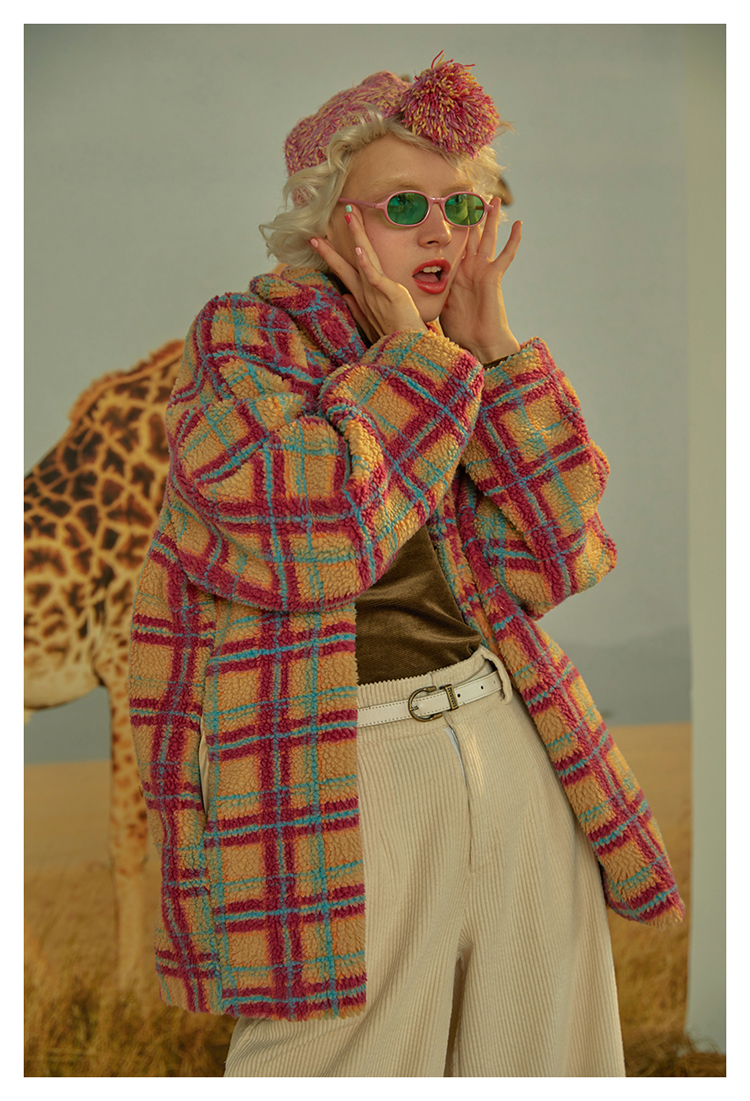 Red and blue plaid lambskin lapel long sleeved silhouette coat