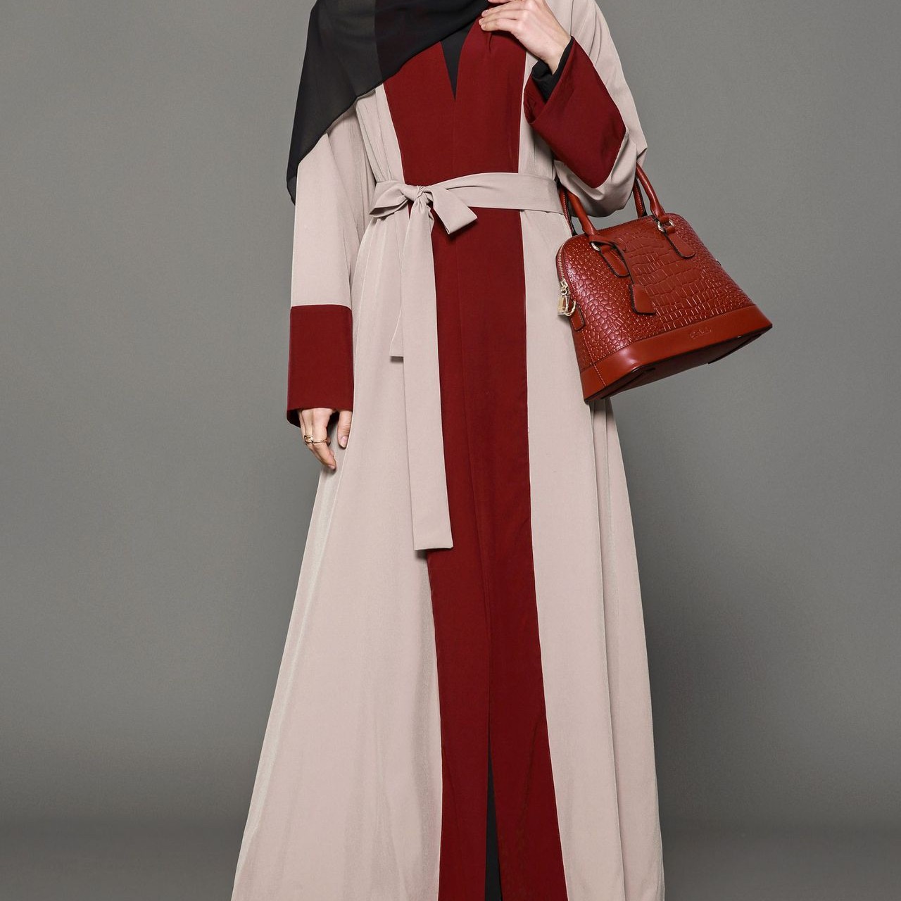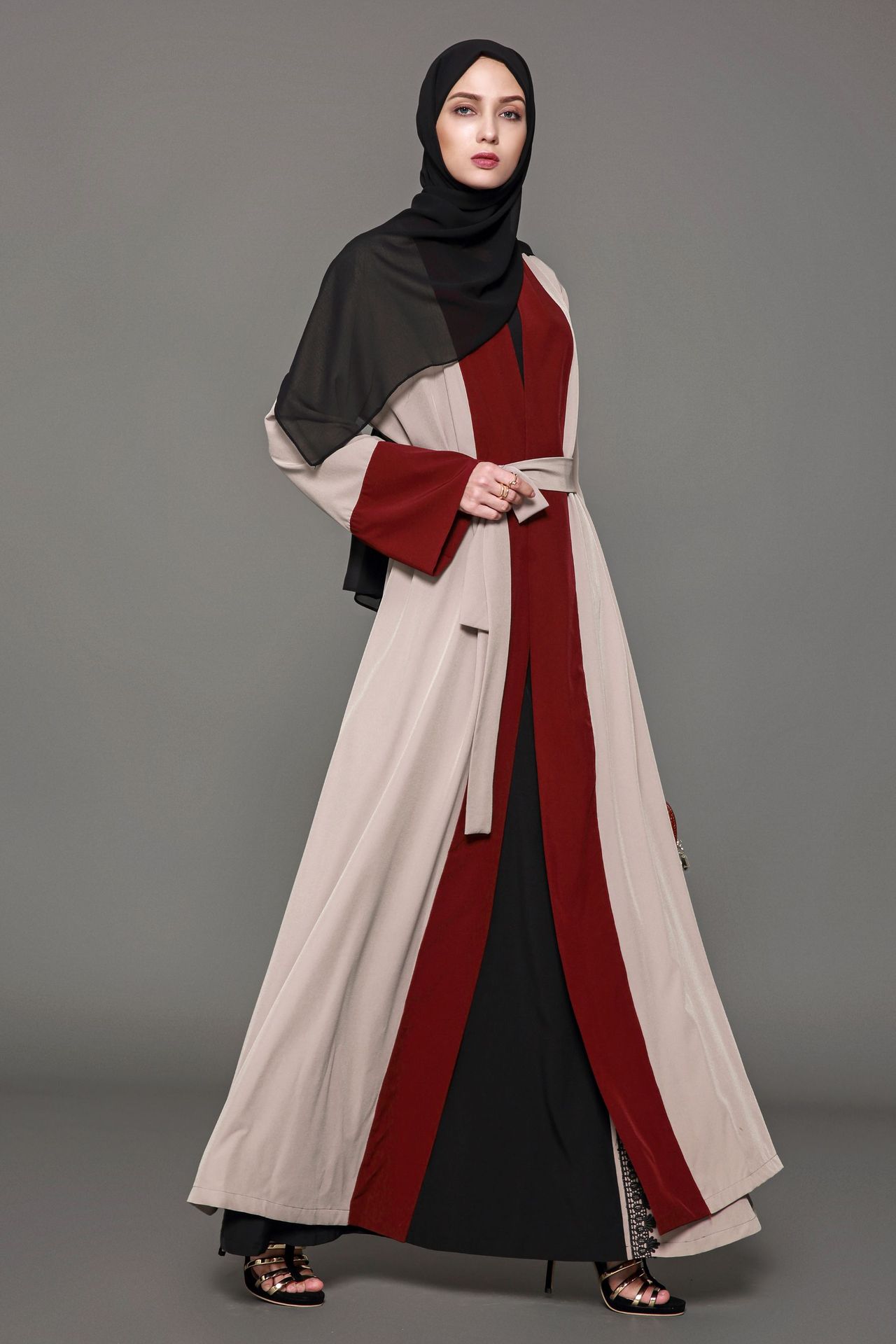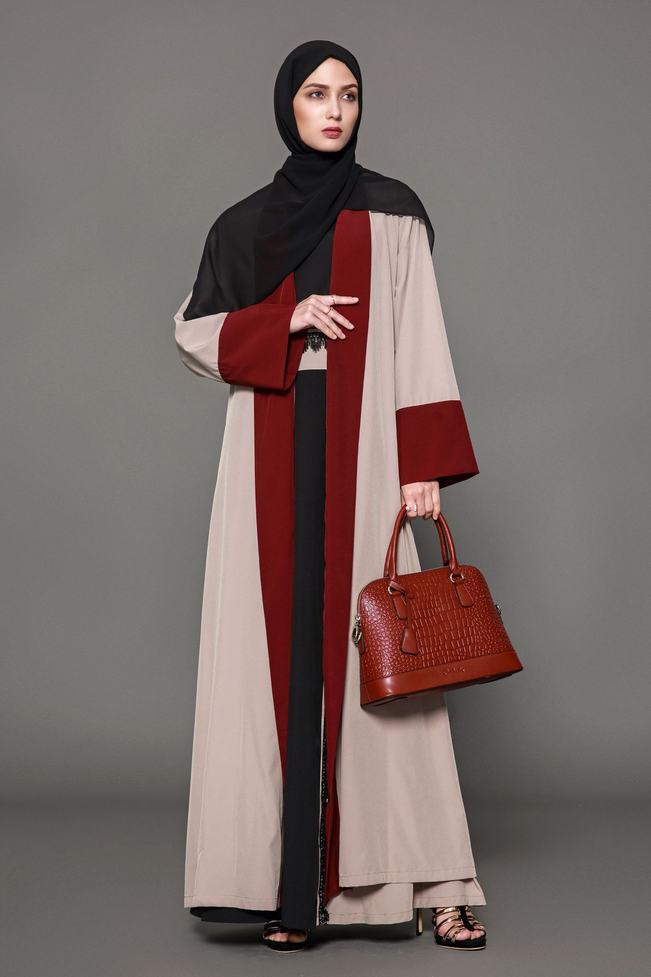 Red Brown Patchwork Flare Long Sleeved Dress