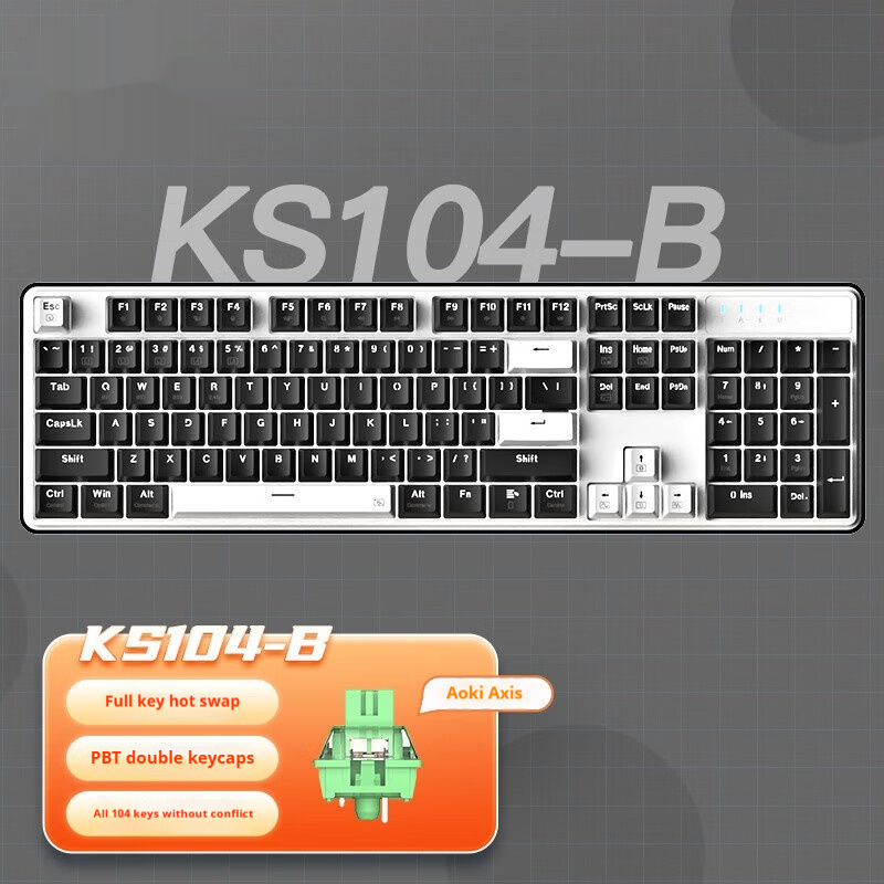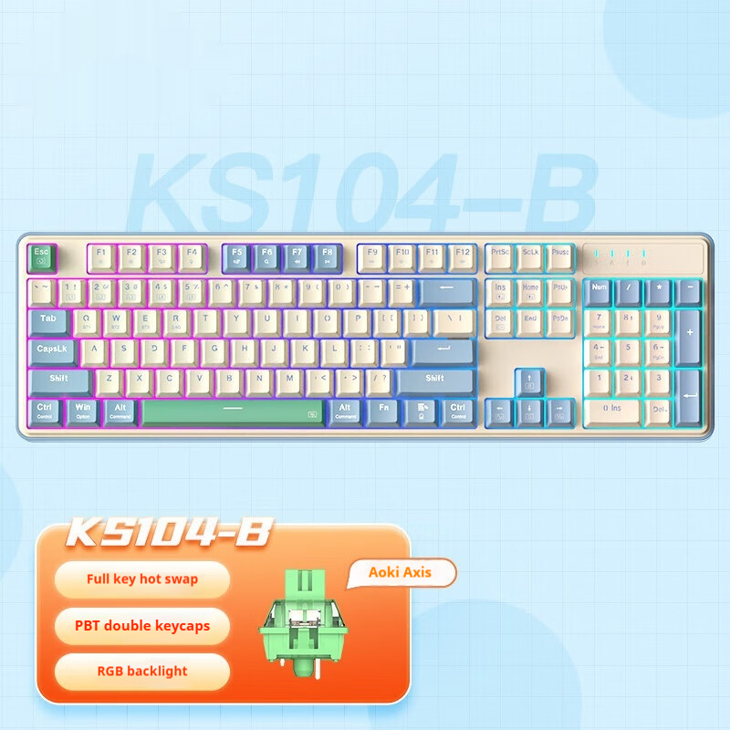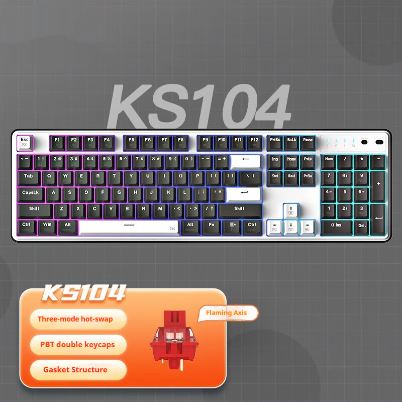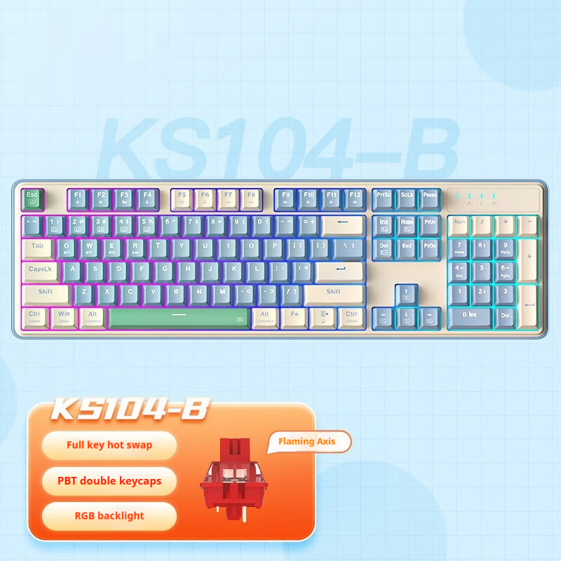 Color: 104 keys White Blue wired monochrome green wood shaft, 104 keys black white wired monochrome green wood shaft, 104 keys yellow purple blue wired RGB green wood shaft, 104 keys Purple Yellow Blue wired RGB fire red shaft, 104 key black white Three mode RGB fire red axis, 104 key white blue Three mode RGB fire red axis, 104 key gradient three mode RGB Hydra Zen Frost axis