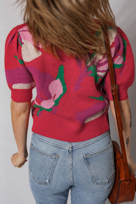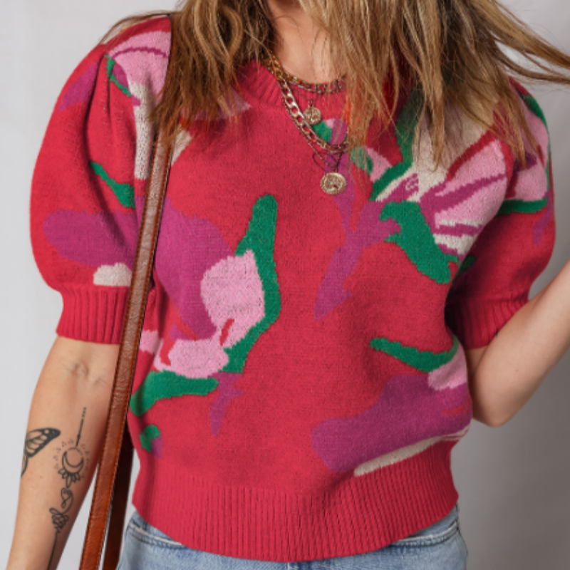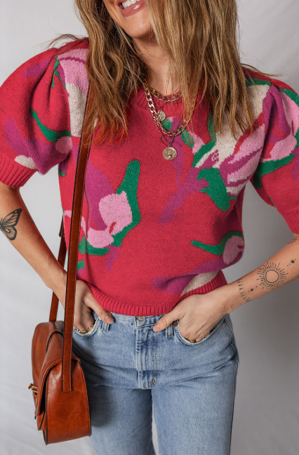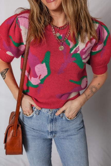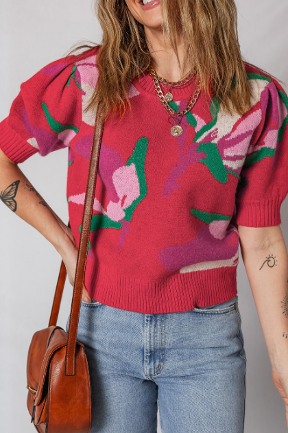 Red Floral Abstract Print Short Puff Sleeve Sweater