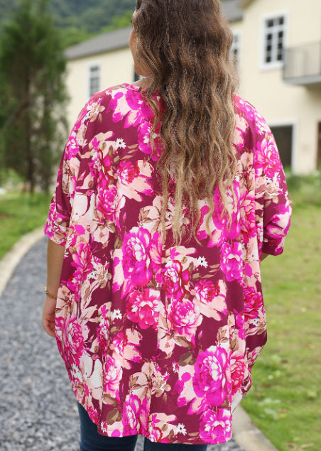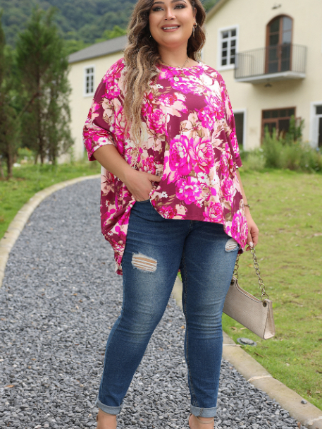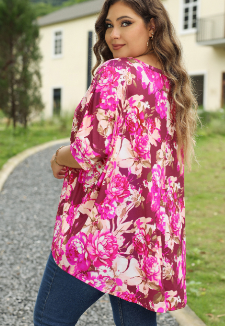 Red Floral Print Short Sleeve Plus Size Blouse