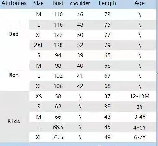 Size: XS, S, M, L, XL, Dad M, Dad L, Dad XL, Dad 2XL, Mom S, Mom M, Mom L, Mom XL