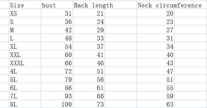 Size: XS, S, M, L, XL, 2L, 3L, 4L, 5L, 6L, 7L, 8L