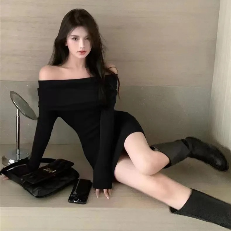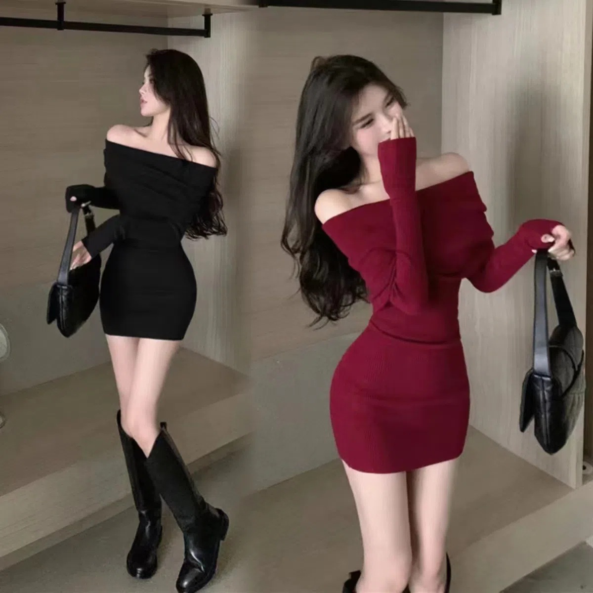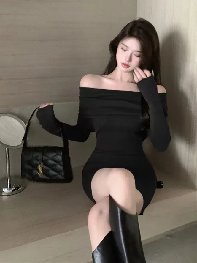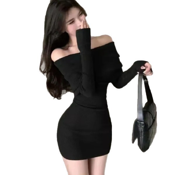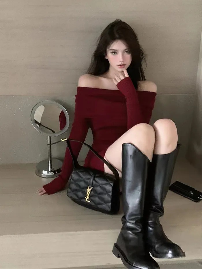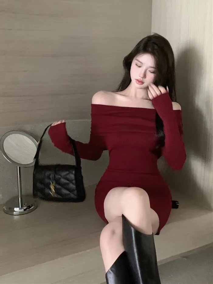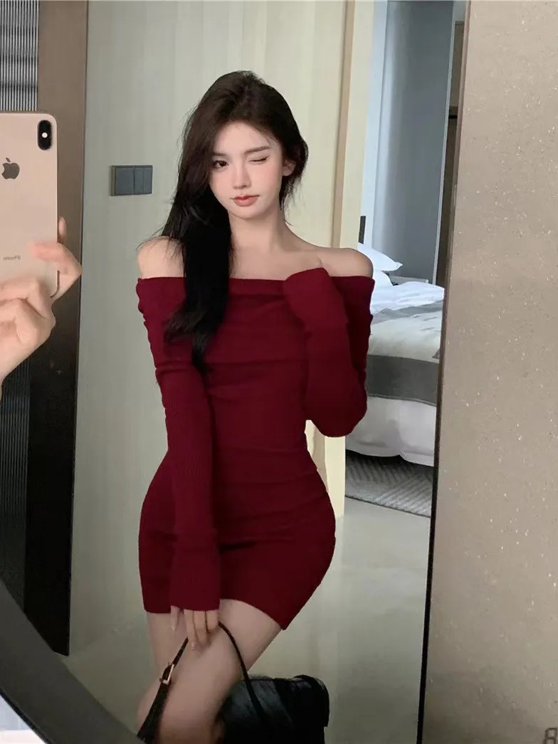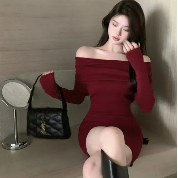 Red Slimming Off Shoulder Knitted Dress For Women