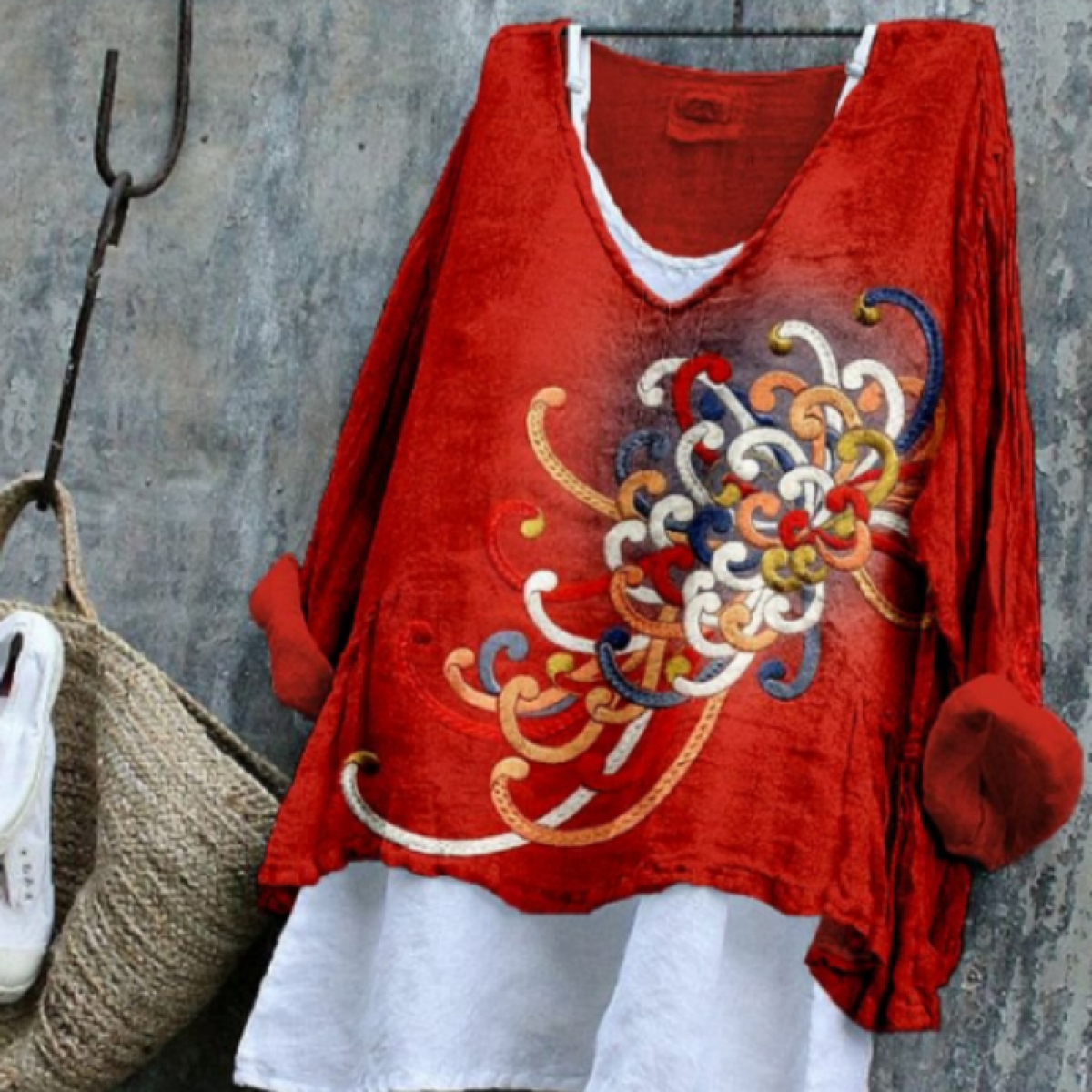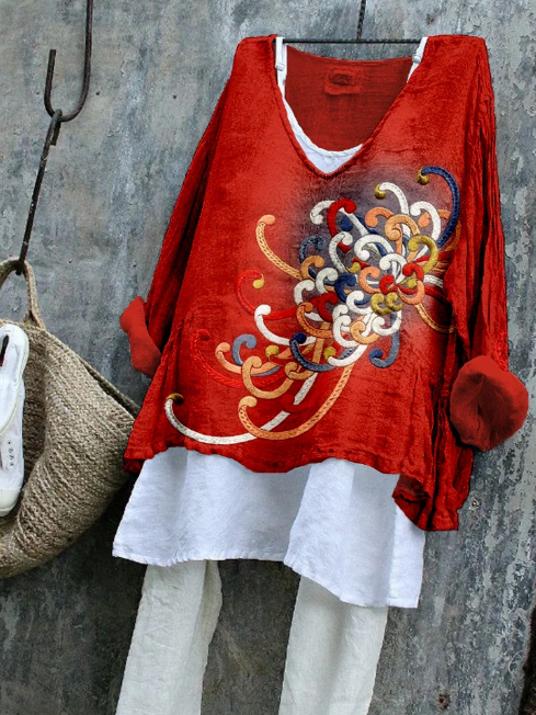 Red Spider Lily Linen Blend Long-sleeve Top