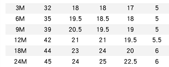 Suitable height: 3M (52cm), 6M (56cm), 9M (73cm), 12M (80cm), 18M (85cm), 24M (90cm)