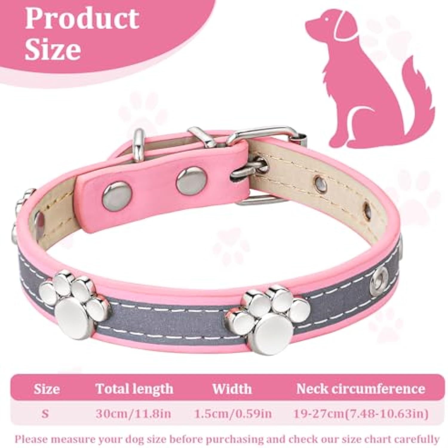 【Adjustable】Length of this dog collar S is 30cm, width is 1.5cm, neck circumference is 19-27cm,M is 37cm , width is 1.5cm, neck circumference is 26-34cm,L is 42cm , width is 2cm, neck circumference is 30-38cm,XL is 50cm , width is 2.5cm, neck circumference is 35-46cm, XXL is 60cm , width is 3cm, neck circumference is 45-55cm,which is adjustable with 5 adjustable holes on its surface, suitable for most dogs or cats.