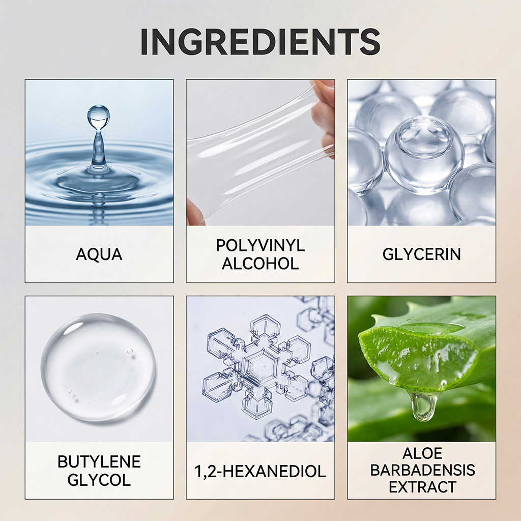 Ingredients: Water, Polyvinyl Alcohol, Glycerin, Butylene Glycol, 1,2-Hexanediol, Aloe Barbadensis Leaf Extract