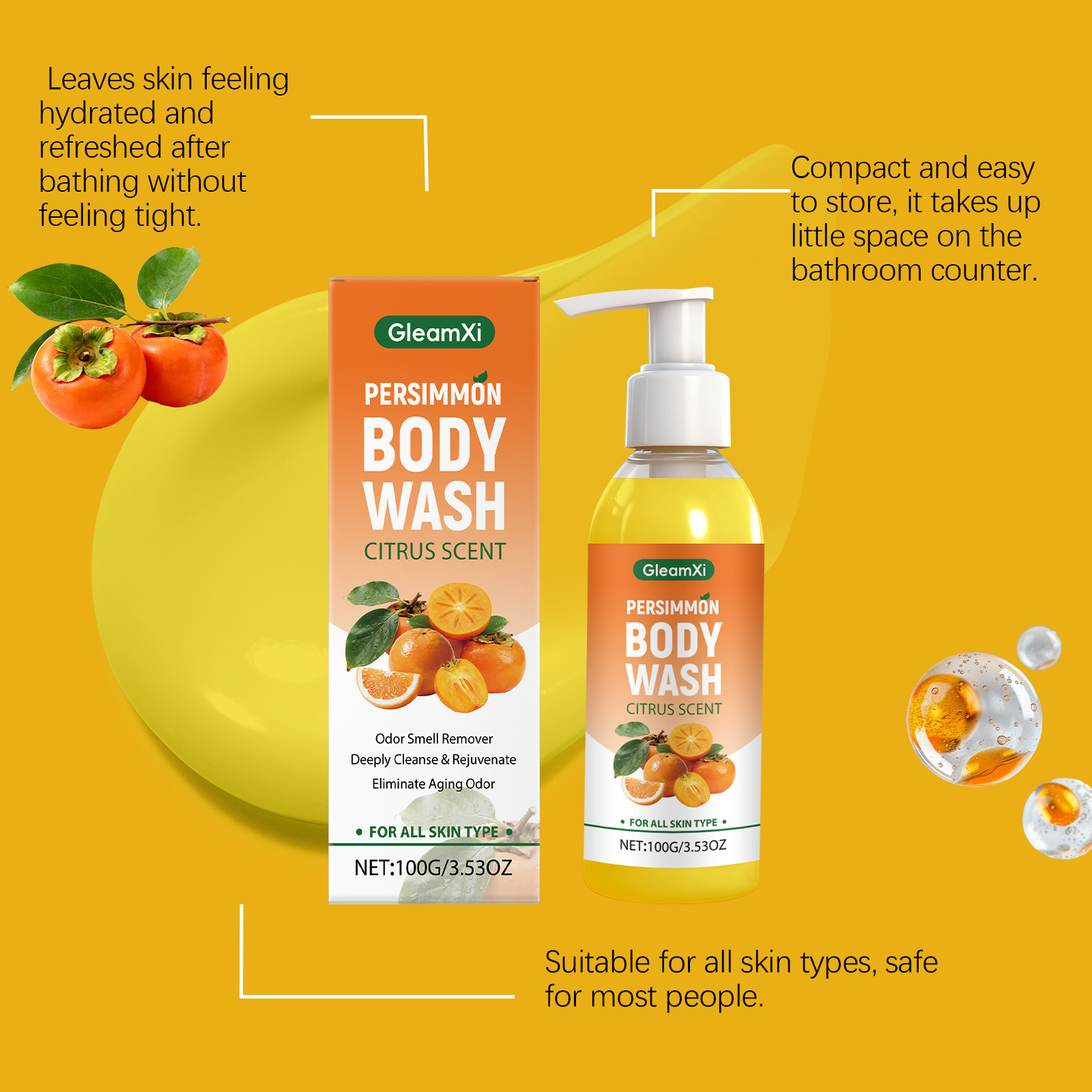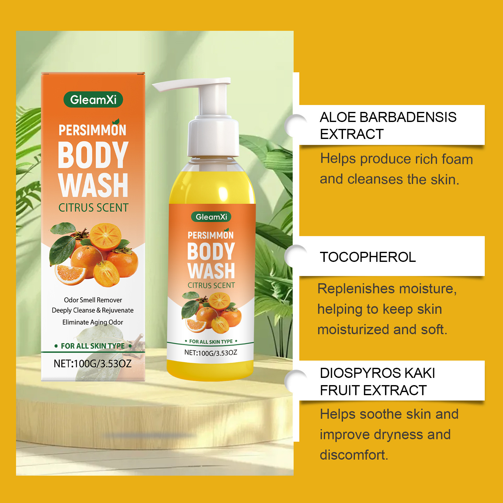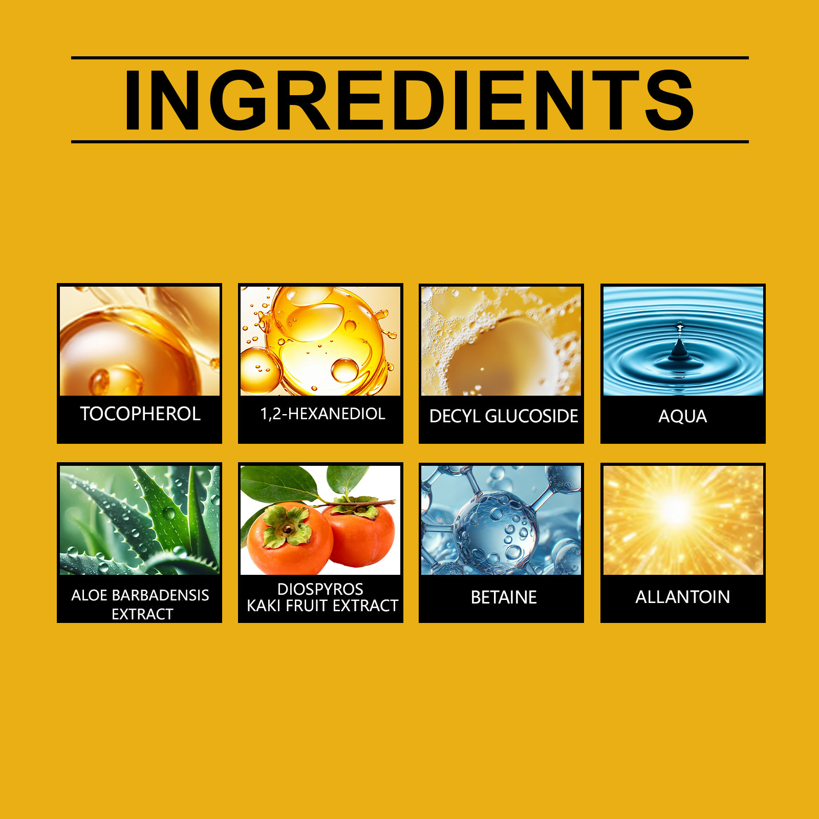 Ingredients: water, decyl glucoside, 1,2- hexanediol, allantoin, betaine, persimmon extract, tocopherol (vitamin E), aloe vera extract.