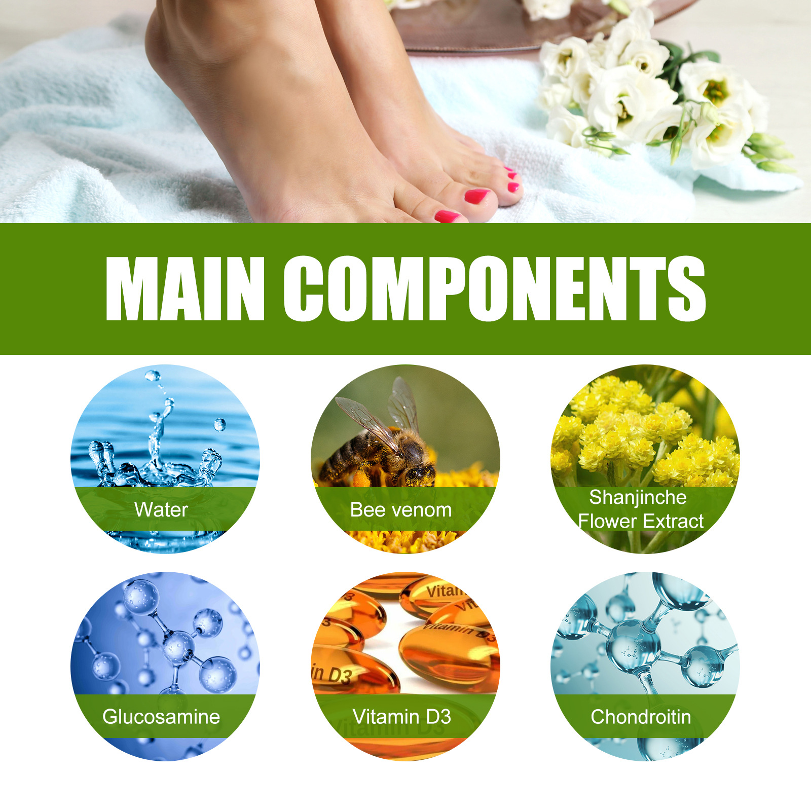 Ingredients: water, bee venom, extract of camellia, glucosamine, vitamin D3, chondroitin