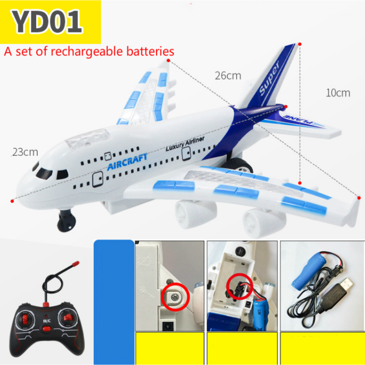 Included accessories: airplane, remote control, USB charging cable, rechargeable lithium battery, tail wing