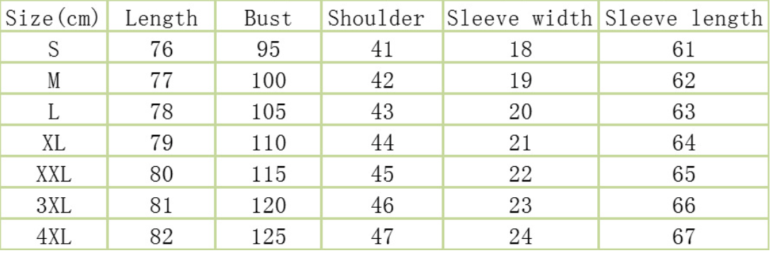 Size:S,M,L,XL,XXL,3XL unit:cm